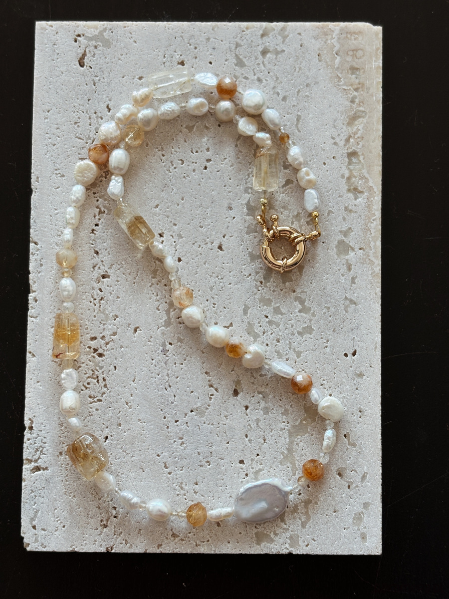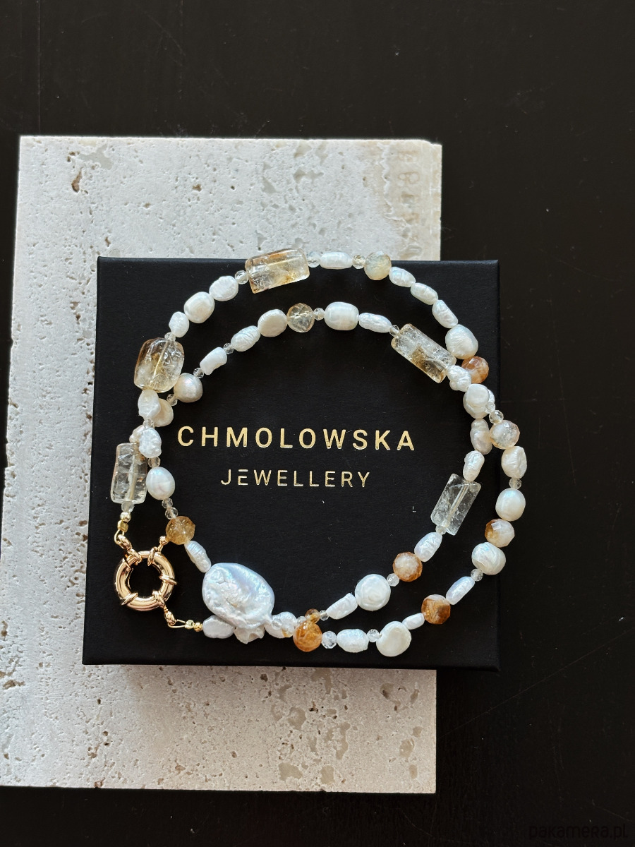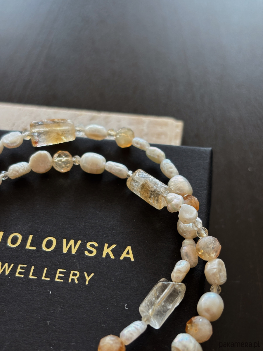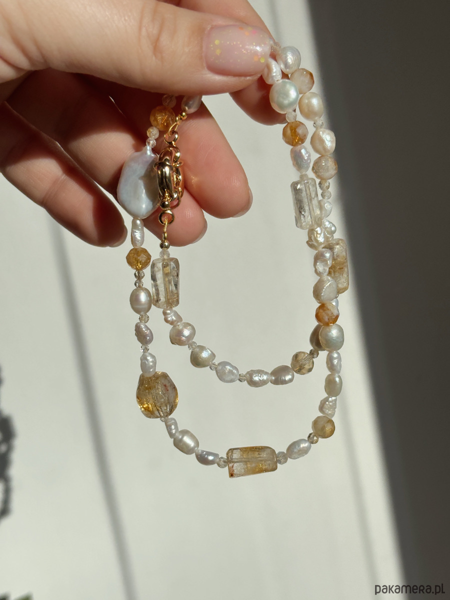 Naszyjnik wykonany jest na lince jubilerskiej z kamieni Cytrynu w różnych formach, Pereł naturalnych i ozdobnego zapięcia rodowanego złotem.