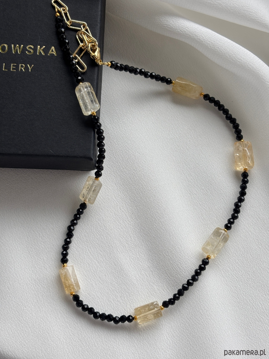 Naszyjnik wykonany jest z na lince jubilerskiej z użyciem turmalinów fasetowanych i brył cytrynu, zapięcia i łańcuszka ze stali ch.