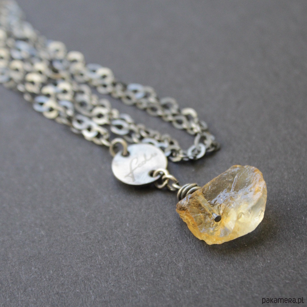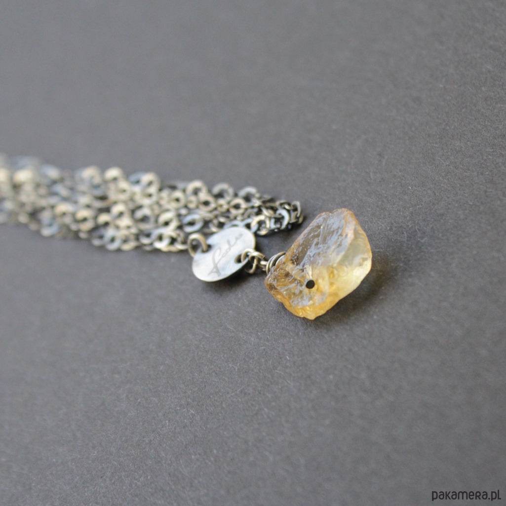 Naszyjnik wykonany został z oksydowanego srebra próby 925 oraz przepięknej surowej bryłki cytrynu o wielkości 1,5 cm.