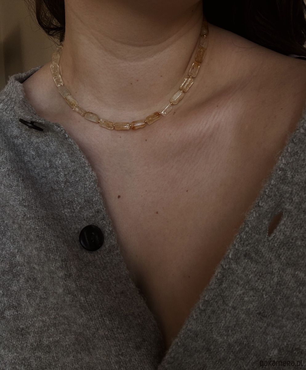Naszyjnik składa się z kamieni Cytrynu, pozłacanych przekładek, zapięcia i łańcuszka rodowanego złotem.