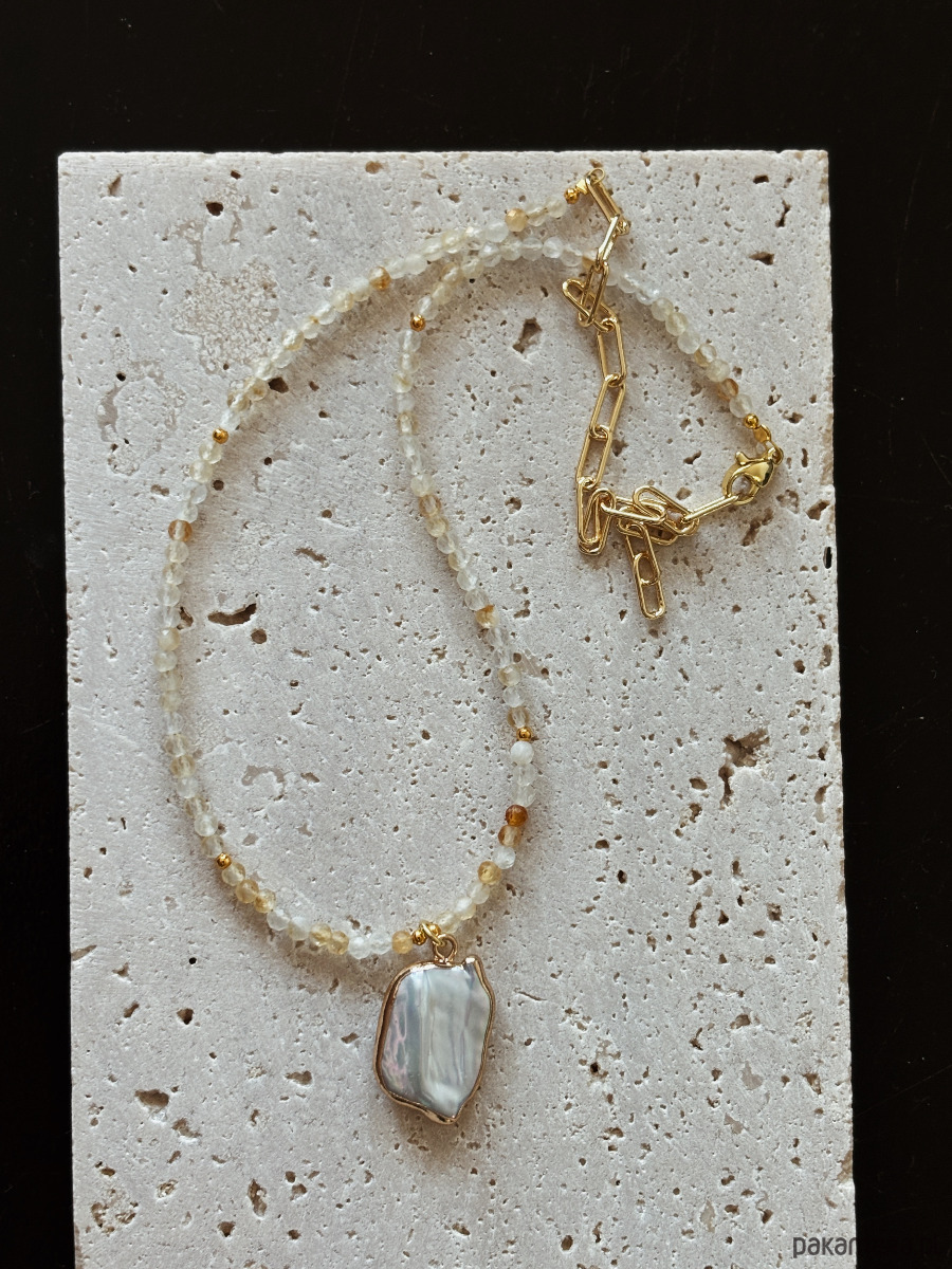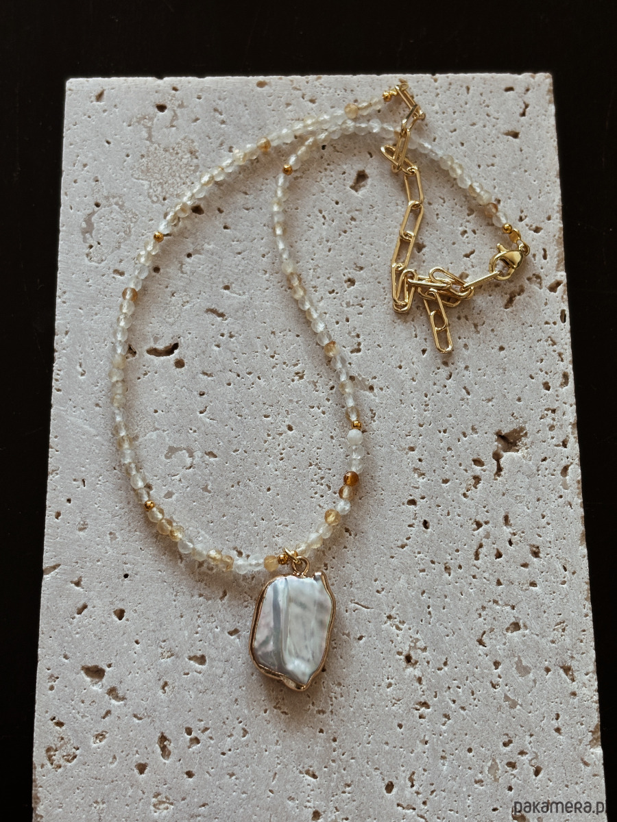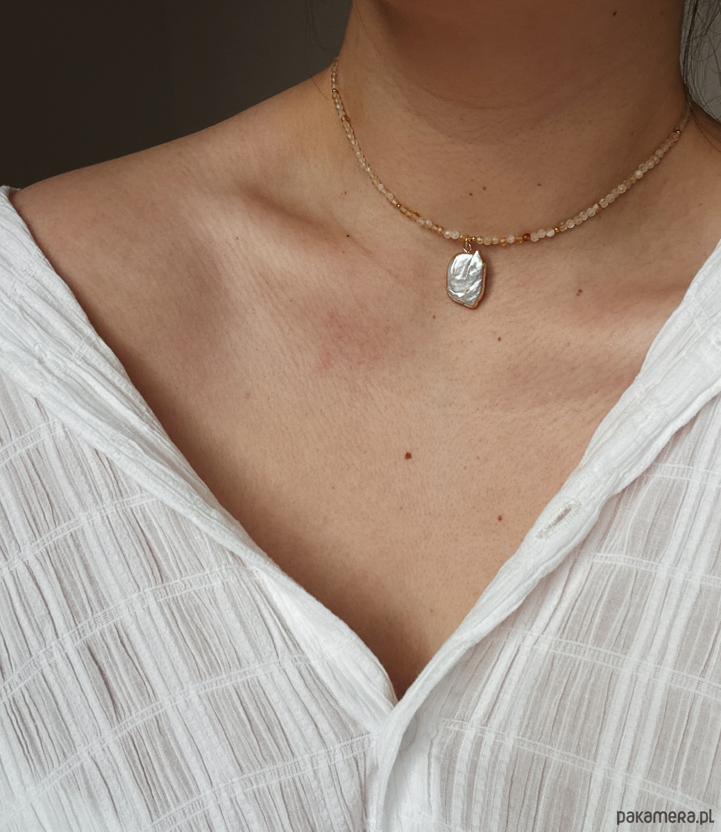 Naszyjnik składa się z kamieni Cytrynu, pozłacanych przekładek, zawieszki z perły, zapięcia i łańcuszka rodowanego złotem.