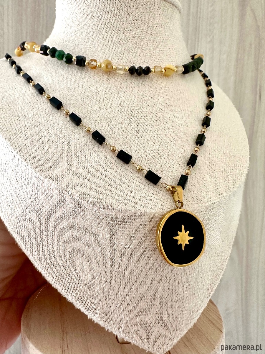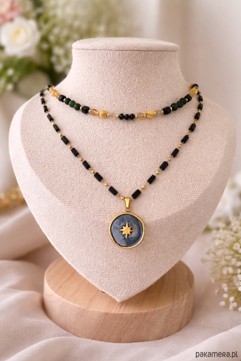 Warstwowy naszyjnik, który przyciągają spojrzenia – połączenie głębokiej czerni, złota i naturalnych kamieni tworzy ponadczasową kompozycję 💫