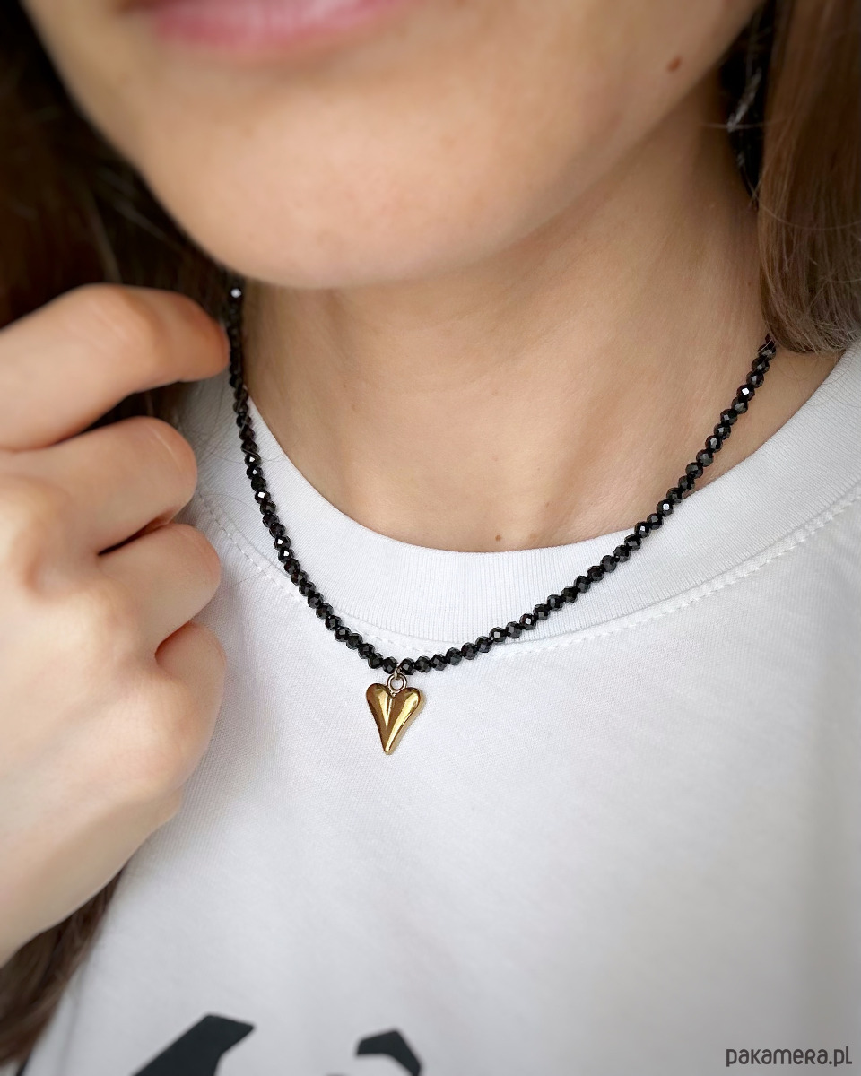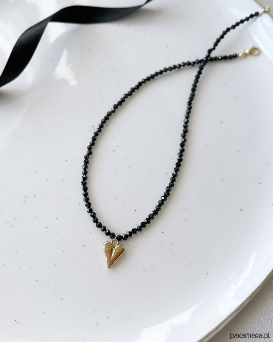 Naszyjnik w klasycznej czerni z naturalnego spinela z pięknym złotym sercem ze stali 🖤