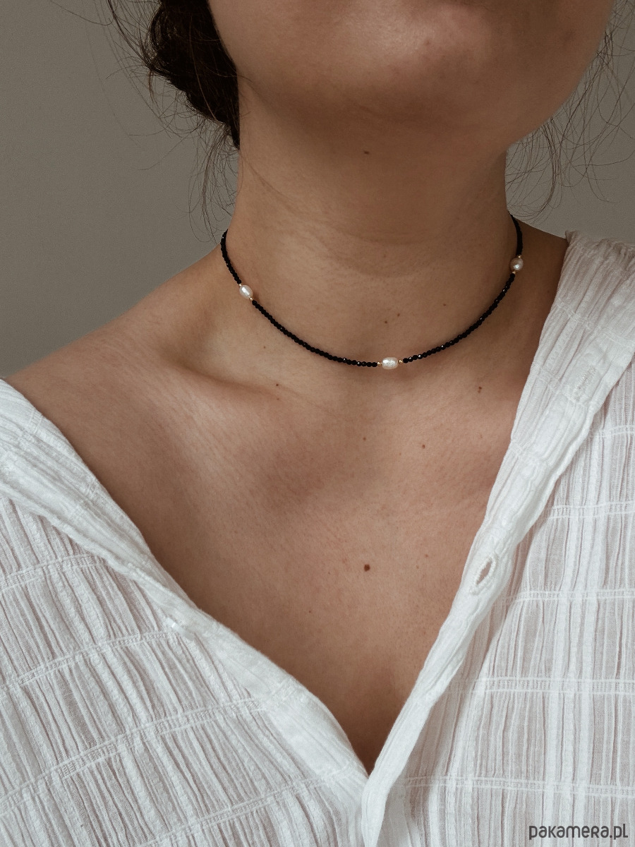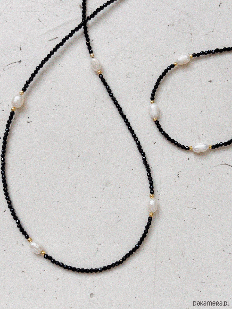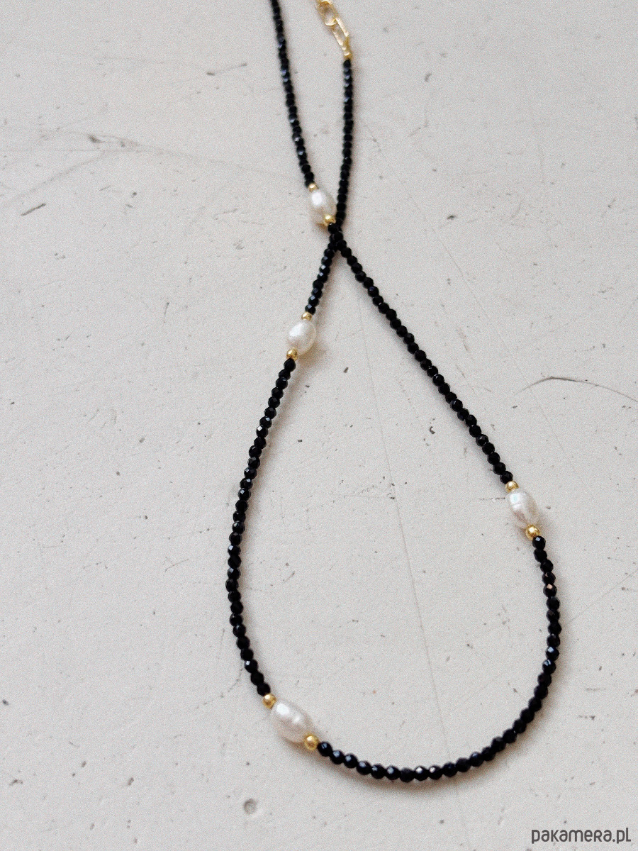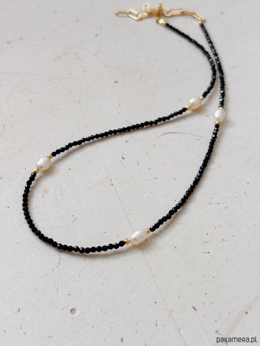 Naszyjnik został wykonany na lince jubilerskiej z fasetowanych kamieni onyks oraz pereł naturalnych, zapięcia i łańcuszka ze st chirurgicznej.