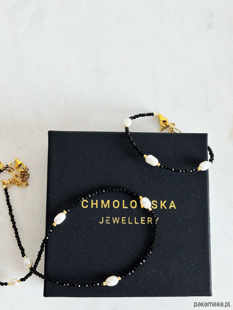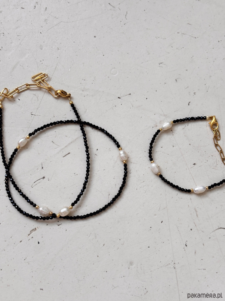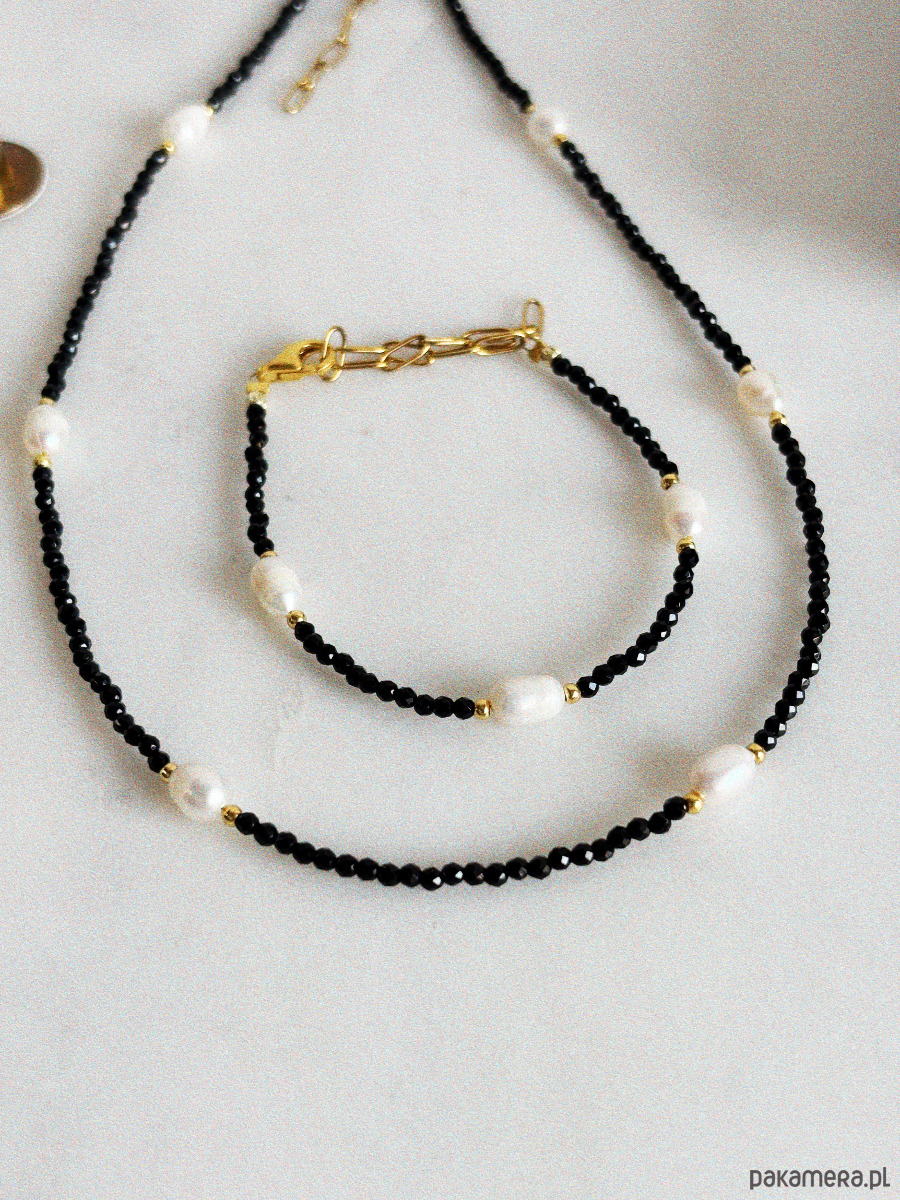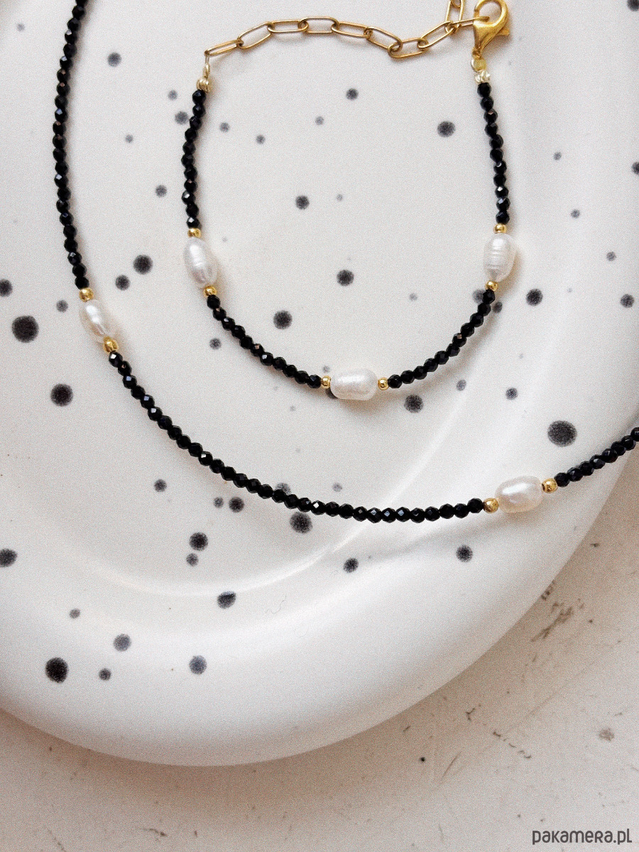 Naszyjnik został wykonany na lince jubilerskiej z fasetowanych kamieni onyks oraz pereł naturalnych, zapięcia i łańcuszka ze st chirurgicznej.