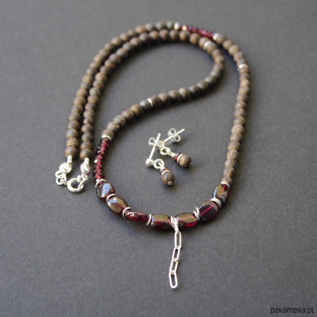 Naszyjnik w komplecie z kolczykami, został wykonany ze srebra próby 925 oraz kuleczek matowych bronzytów i granatów wielkości 0,2 -0,7 cm.