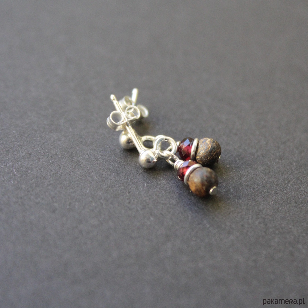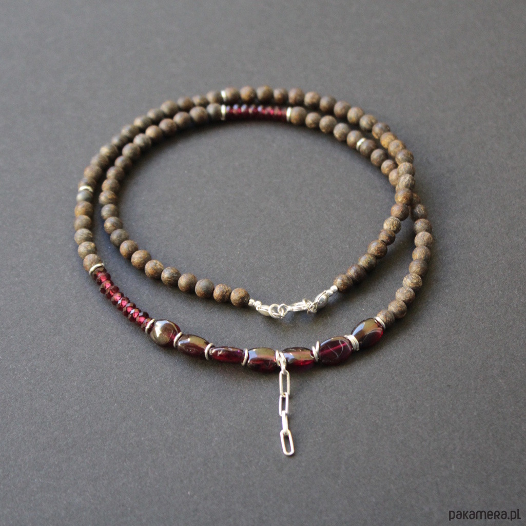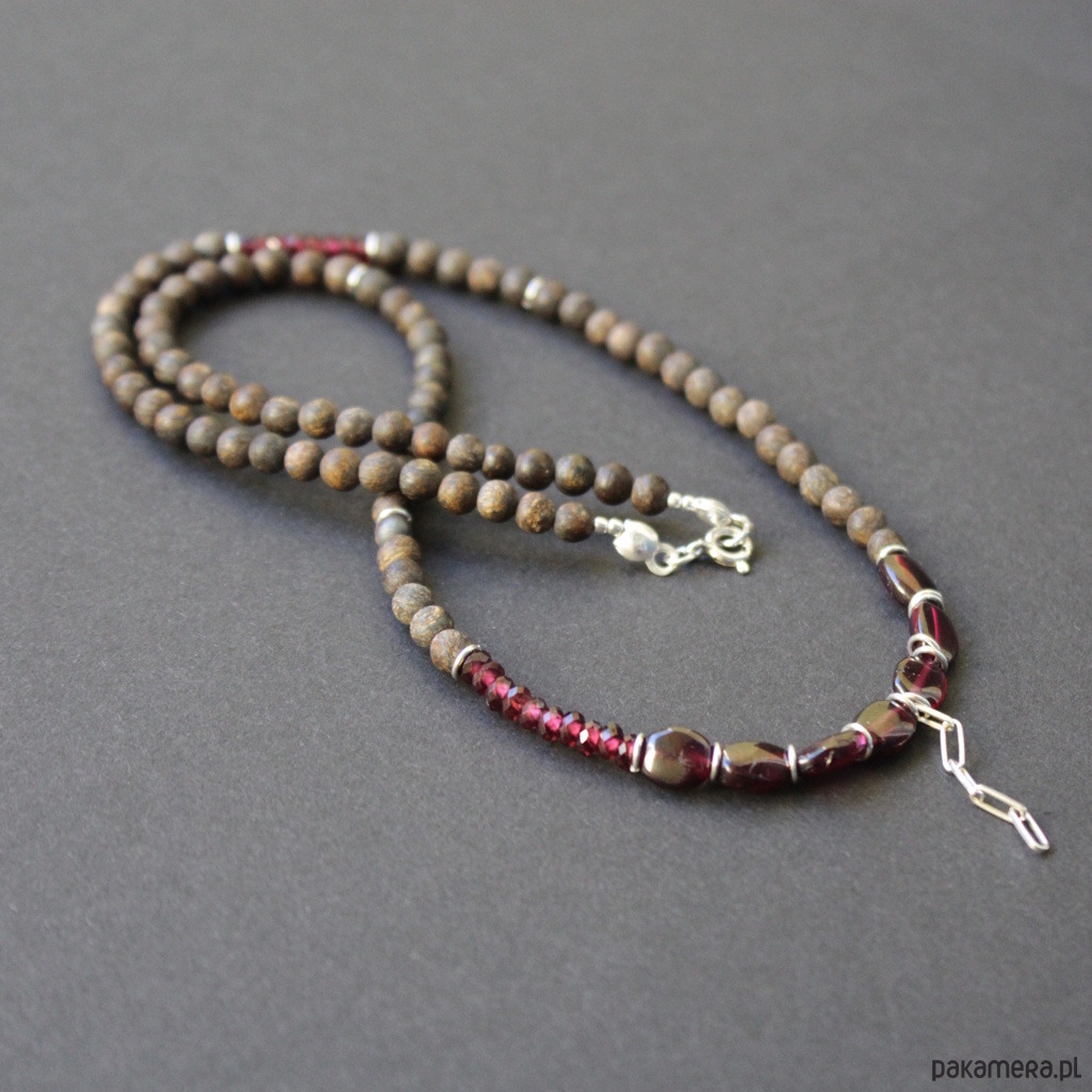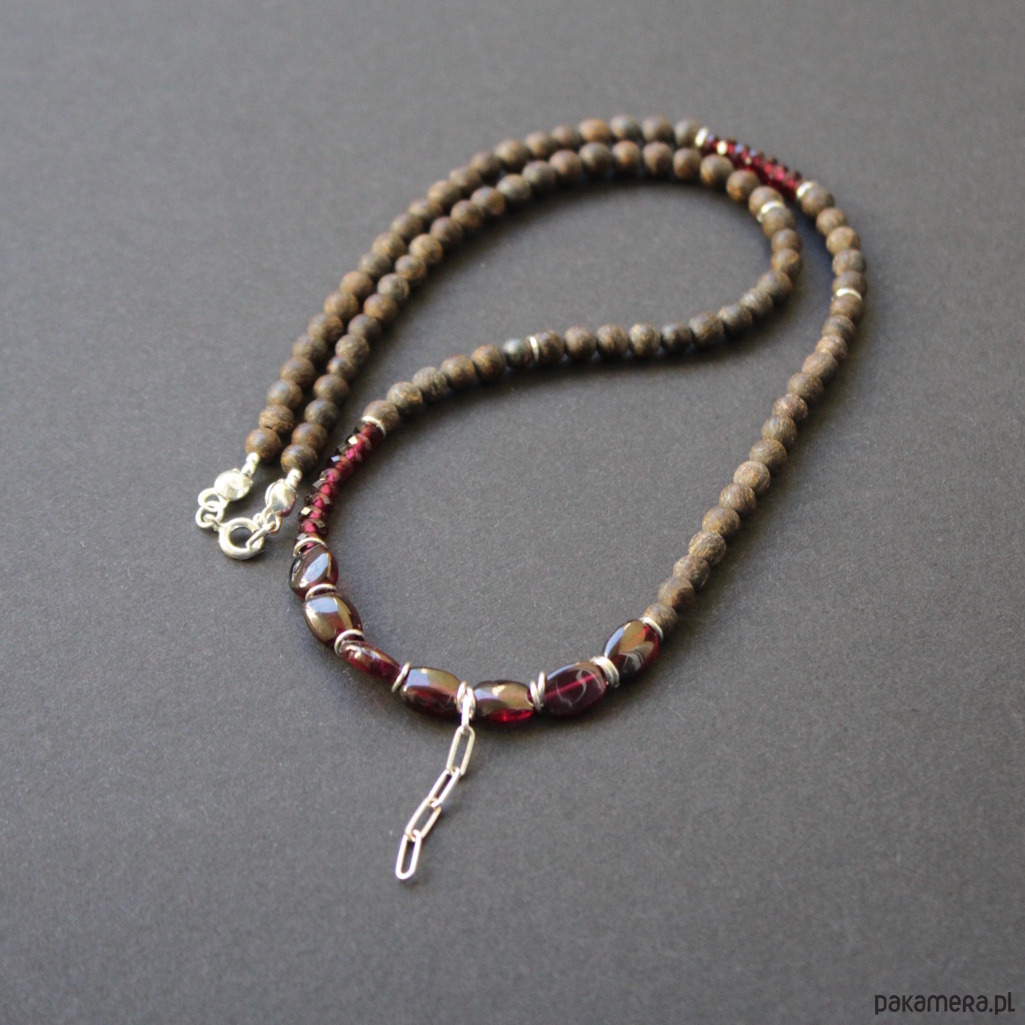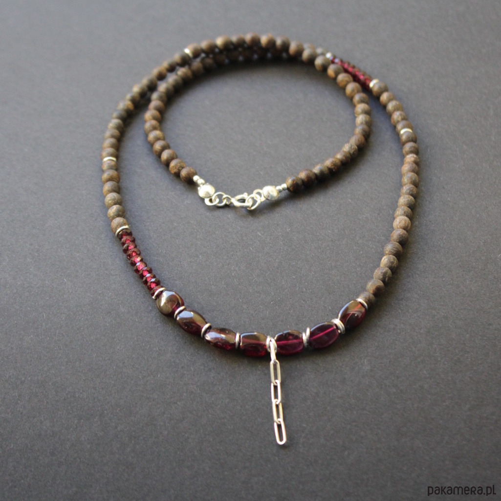 Naszyjnik w komplecie z kolczykami, został wykonany ze srebra próby 925 oraz kuleczek matowych bronzytów i granatów wielkości 0,2 -0,7 cm.