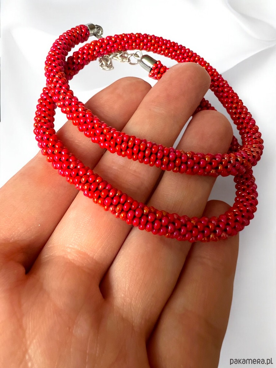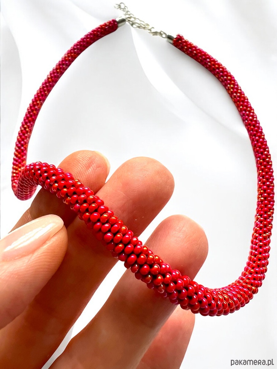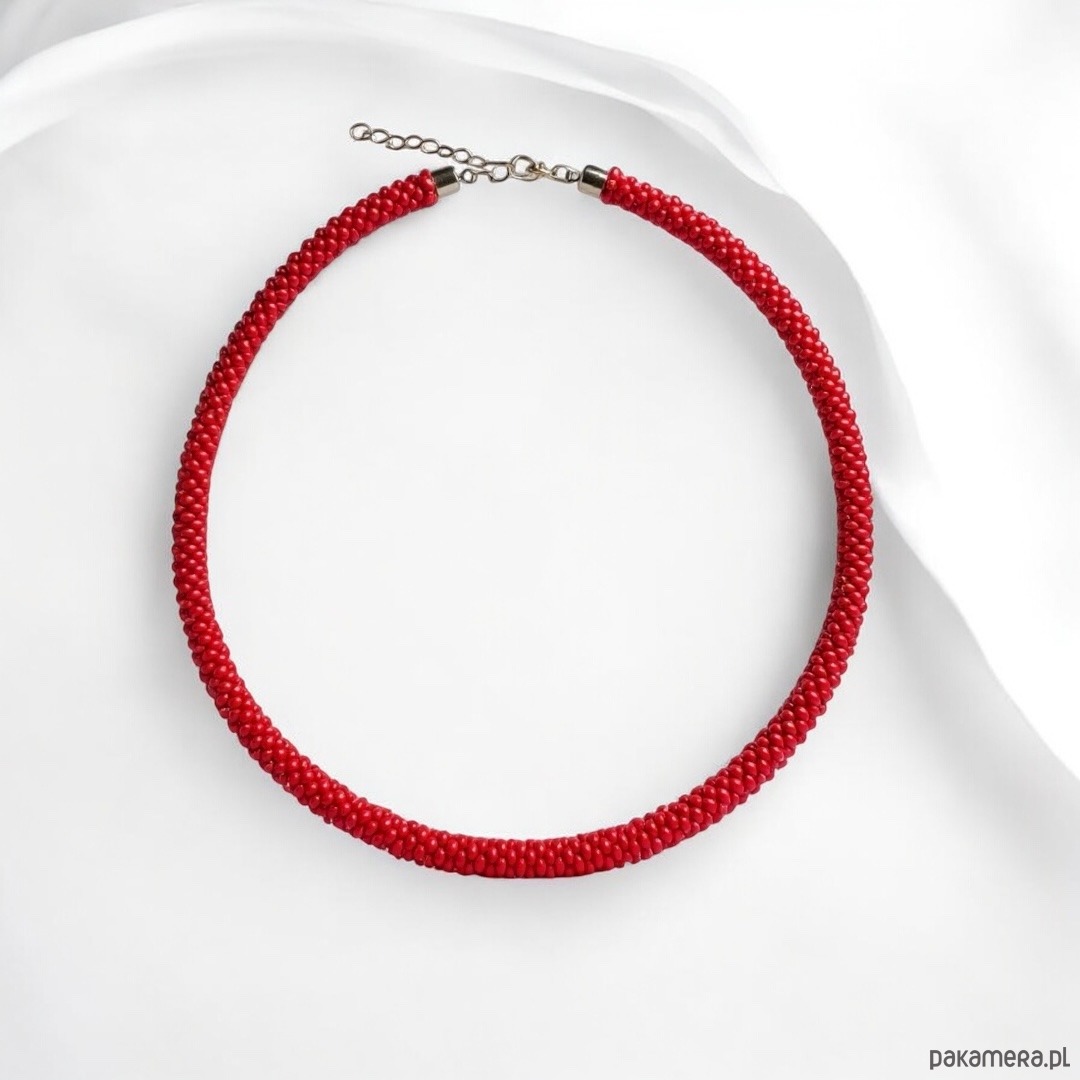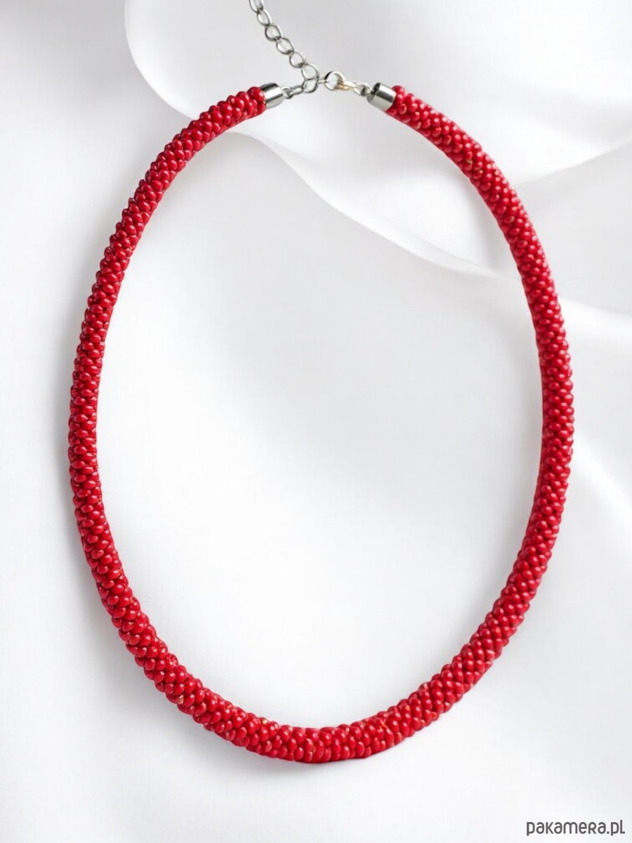 Ręcznie wykonany naszyjnik w formie plecionego sznura z koralików w intensywnym czerwonym kolorze z połyskiem. Prosty, elegancki i bardzo efektowny – pasuje zarówno do codziennych stylizacji, jak i wyjątkowych okazji.