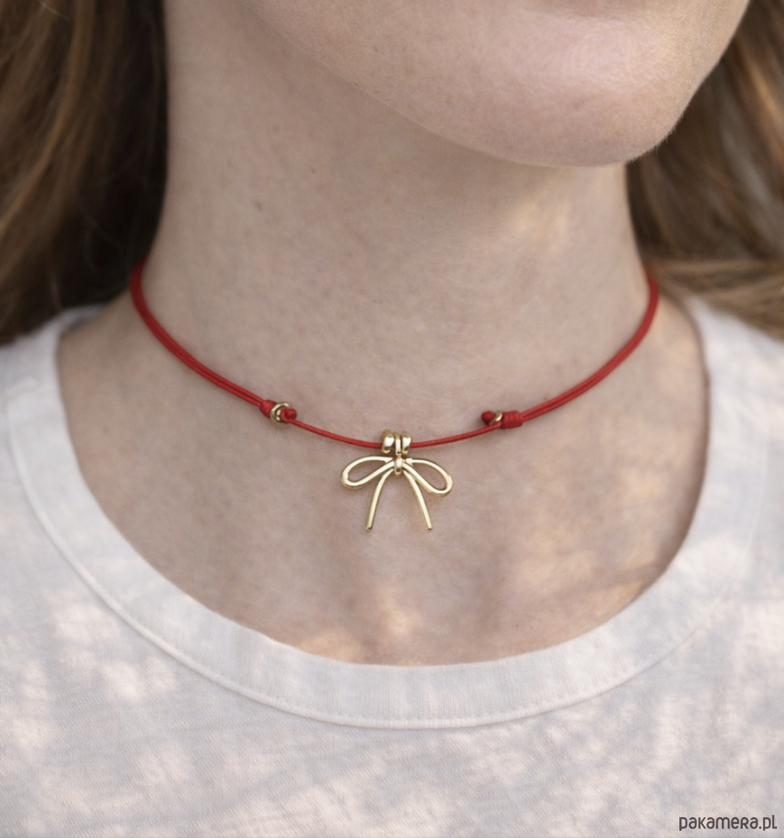Intensywnie czerwony, regulowany sznurek pięknie podkreśla linię szyi i nadaje biżuterii lekkości oraz nowoczesnego charakteru.