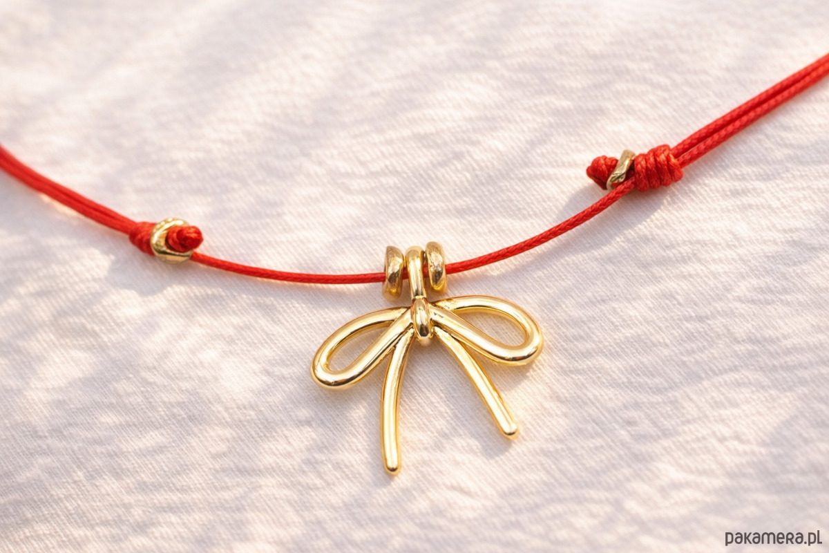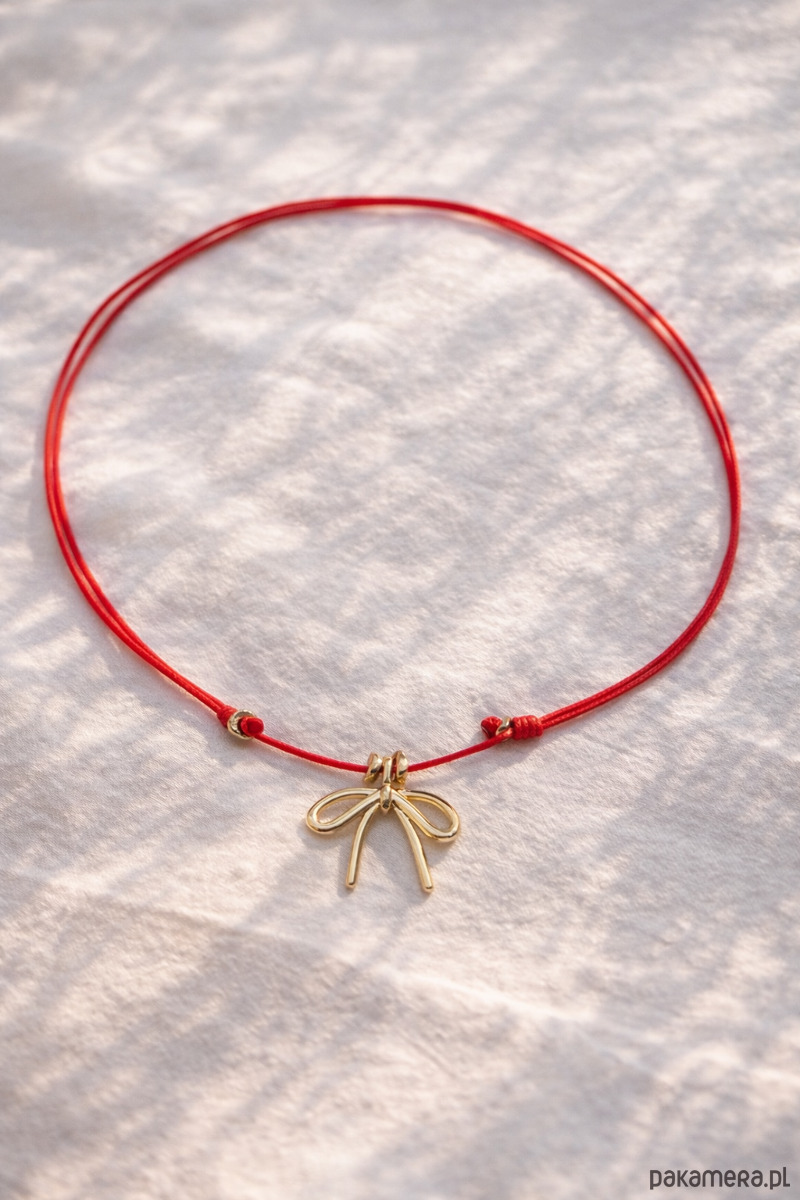 Minimalistyczny choker na czerwonym sznurku z zawieszką w kształcie kokardki wykonanej ze stali szlachetnej.