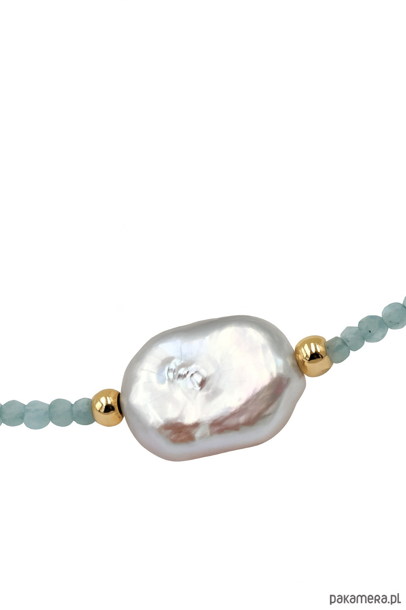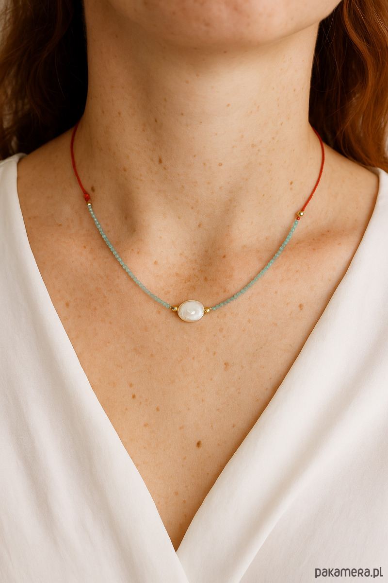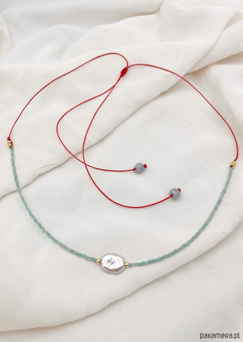 Delikatny naszyjnik na czerwonym sznurku, z naturalnych, drobno fasetowanych kamieni akwamarynu w chłodnym, miętowo-szarym odcieniu. W centrum znajduje się nieregularna perła hodowlana, która nadaje całości subtelnej elegancji i unikatowego charakteru – każda perła jest inna, żadna nie jest „idealna”.