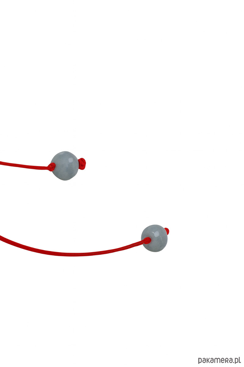 Złote, drobne elementy pięknie przełamują chłodną kolorystykę kamieni i kontrastują z czerwonym sznurkiem.