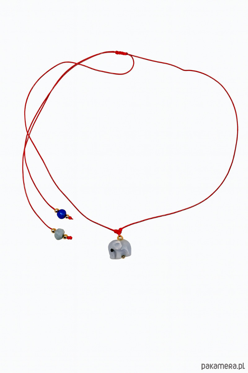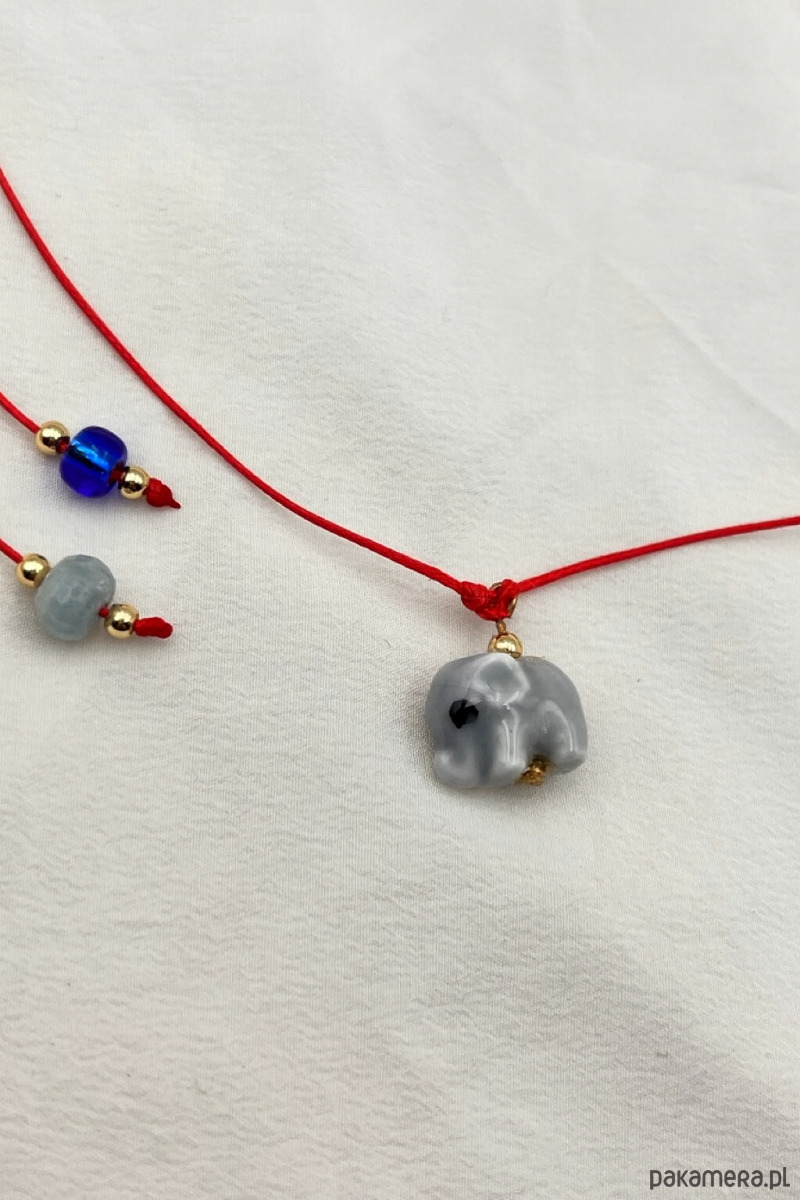 Delikatny, regulowany naszyjnik wykonany z czerwonego, trwałego sznurka – koloru, który od wieków symbolizuje ochronę i dobrą energię. W centrum znajduje się uroczy ceramiczny szary słonik, kojarzony ze szczęściem, mądrością i spokojem.