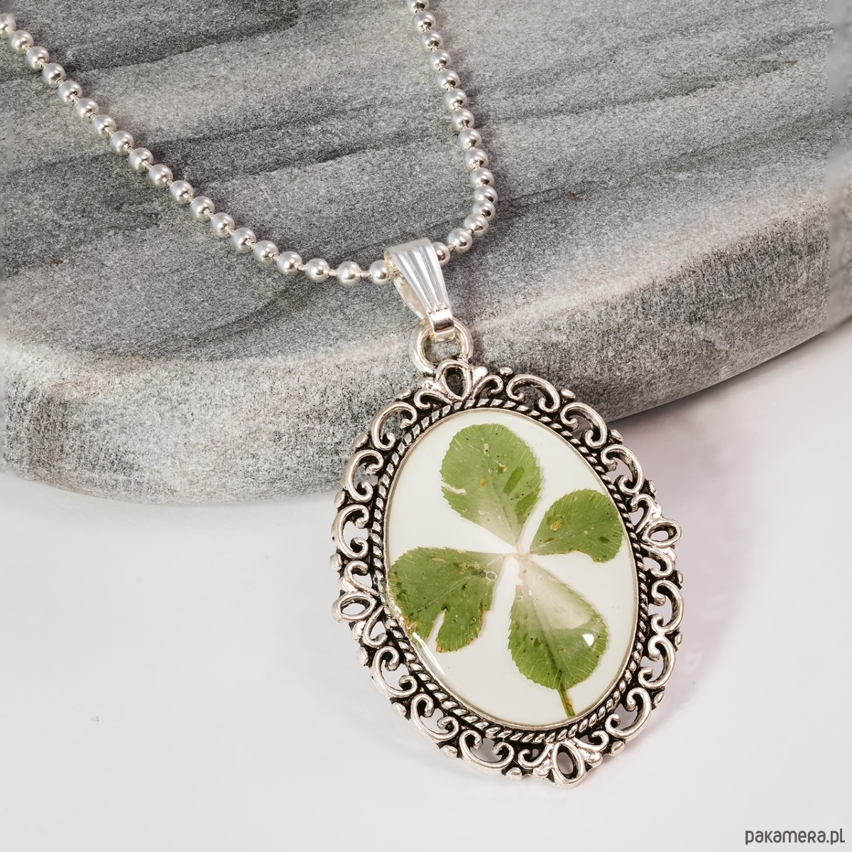 Naszyjnik z czterolistną koniczyną zatopioną w żywicy UV. Wykonany ręcznie z użyciem metalowych półfabrykatów w kolorze srebrnym. Koniczyna wysuszona, a znaleziona była w moim ogródku :) Świetny prezent "Na szczęście".