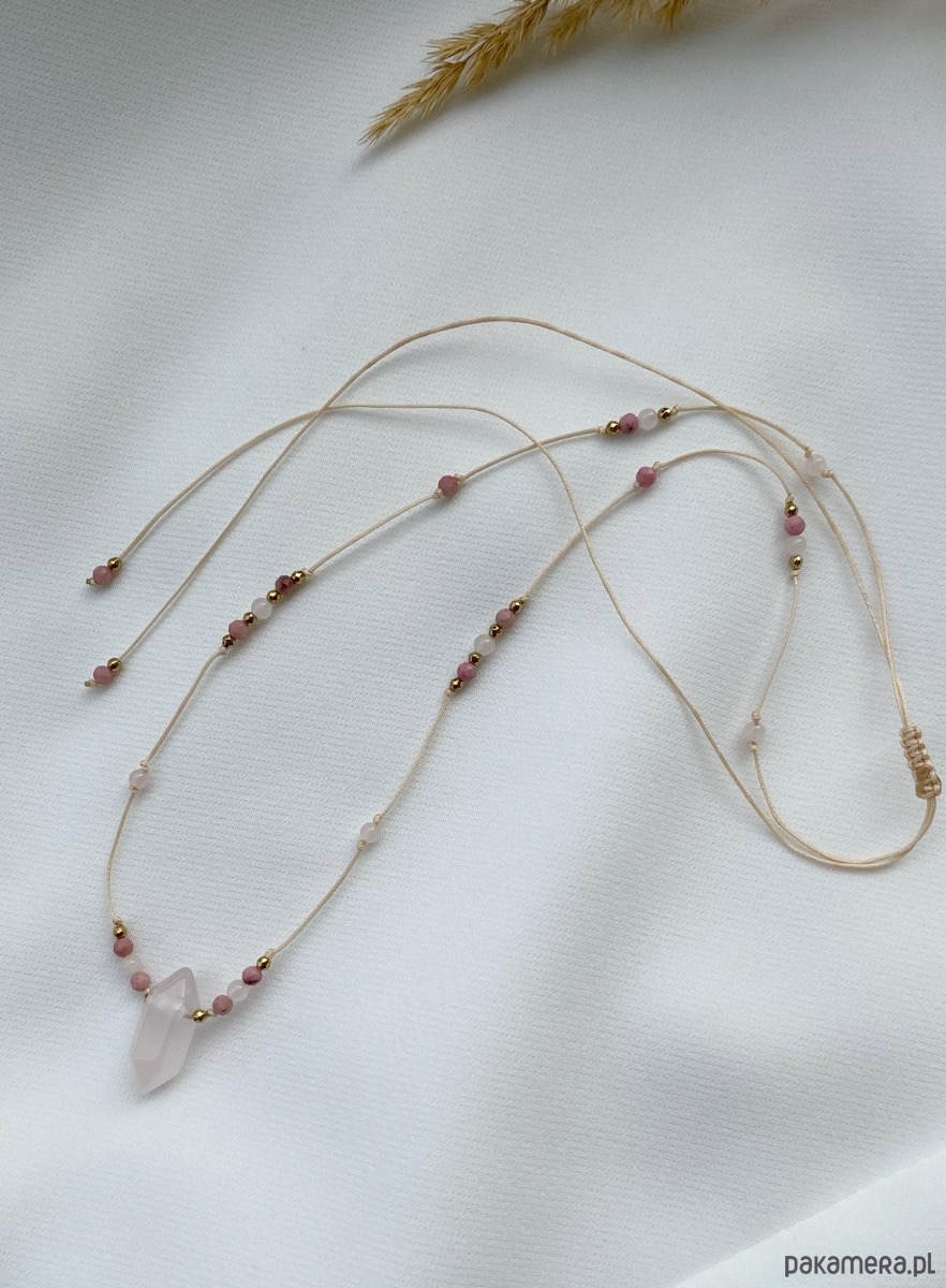 Naszyjnik regulowany z Kwarcem Różowym oraz Rodonitem na beżowym sznurku.