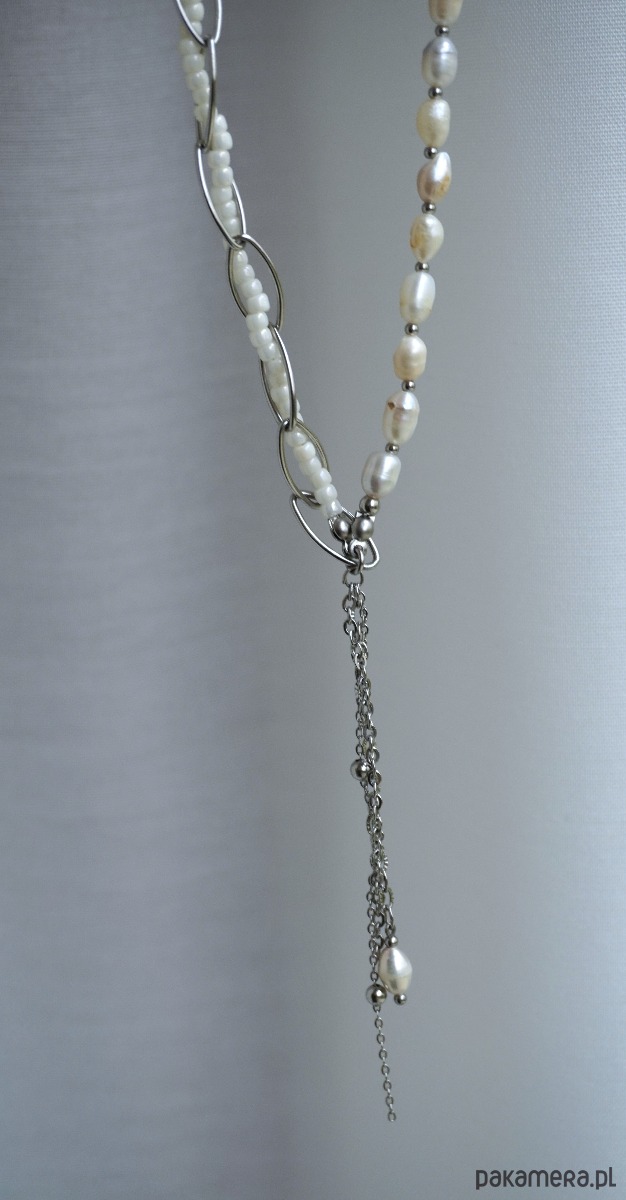 Centralna część naszyjnika wykonana jest z dużych, metalowych ogniw o oryginalnym splocie, wewnątrz których przeplatają się nitki koralików. Na dole znajdują się trzy cienkie łańcuszki o różnej długości, ozdobione perłowymi i metalowymi akcentami. Podczas noszenia poruszają się delikatnie, dodając biżuterii dynamiki i wyjątkowego charakteru.