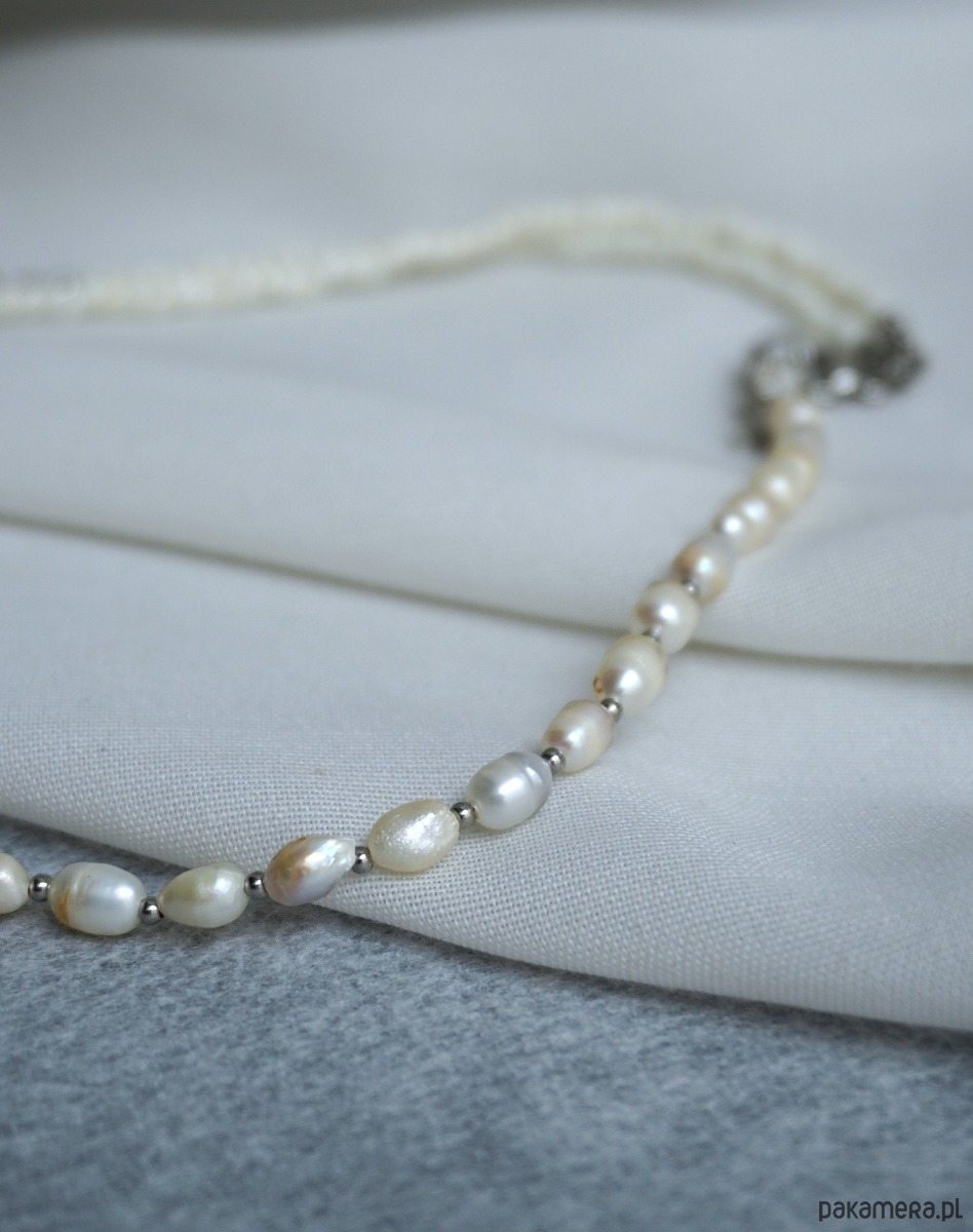 To delikatny naszyjnik, który łączy subtelność pereł z elegancją drobnych koralików, tworząc harmonijną i nowoczesną biżuterię. Z jednej strony znajdują się gładkie, naturalne perły o lekko owalnym kształcie, a z drugiej – drobny biały koralik, nadający całości lekkości i zwiewności.