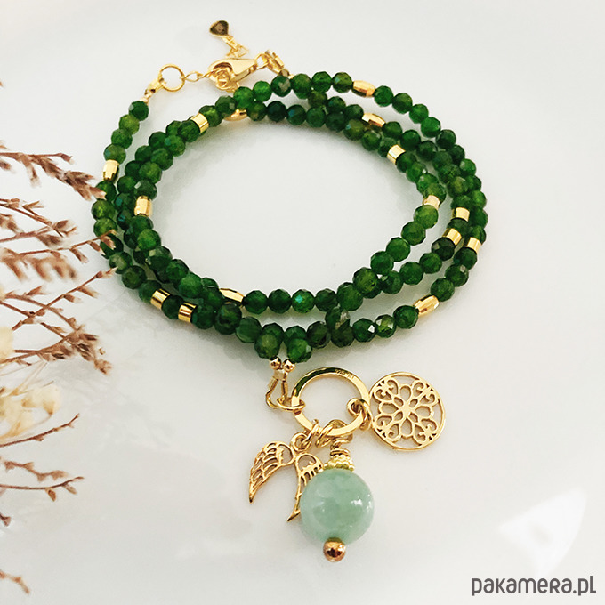 Przepiękny , elegancki naszyjnik z nutką boho z fasetowanych kamieni diopsydów w pieknym nasyconym zielonym kolorze, z zawieszkami - geometryczną oraz skrzydełkami i naturalnym marmurem .