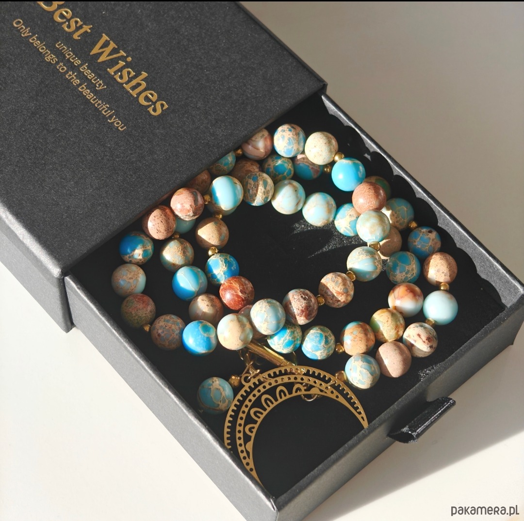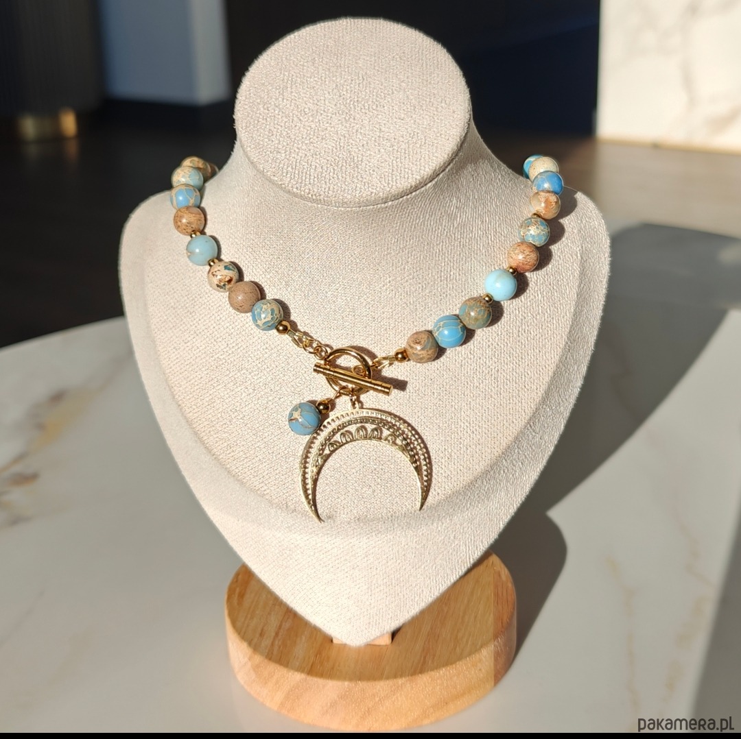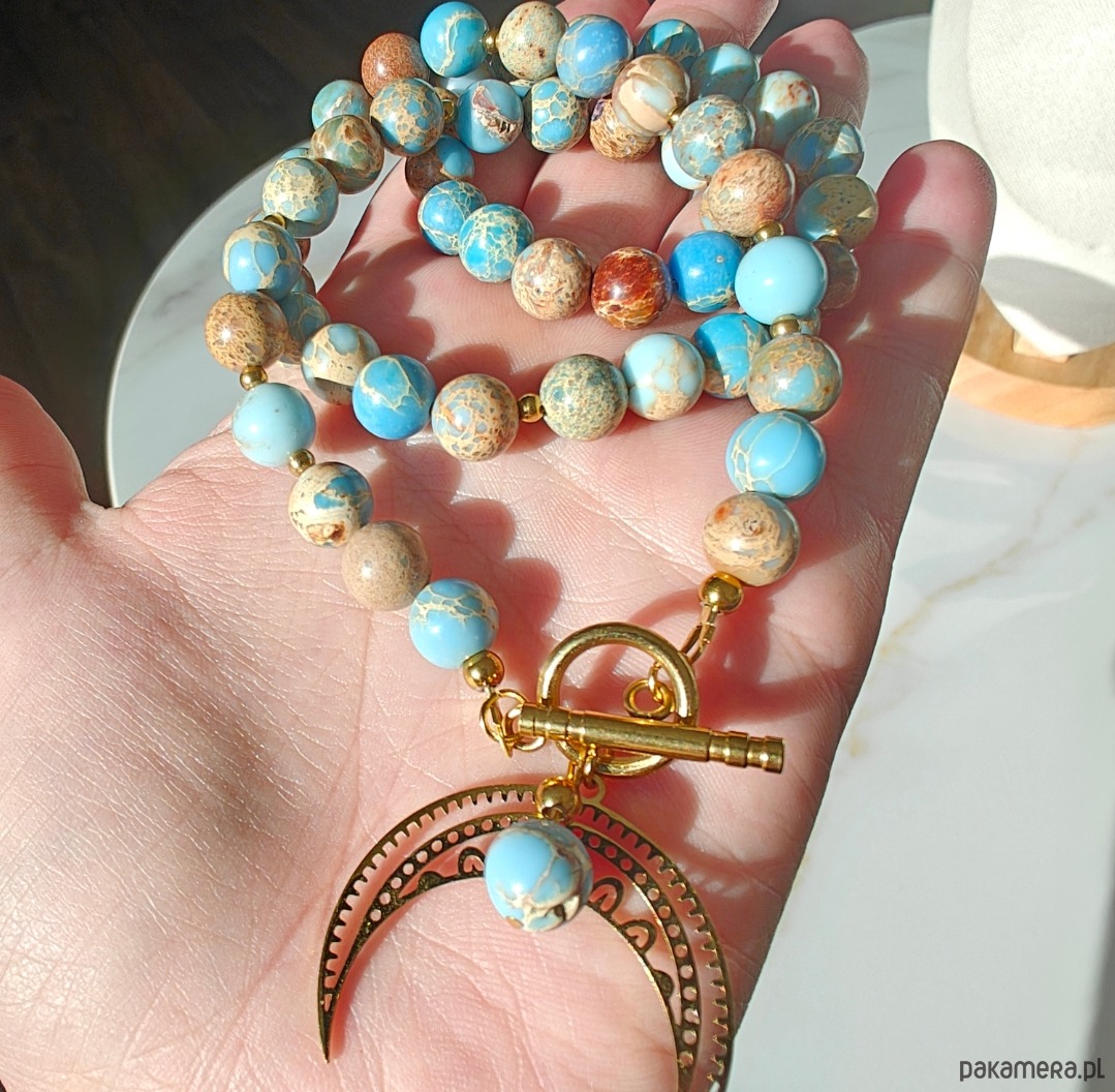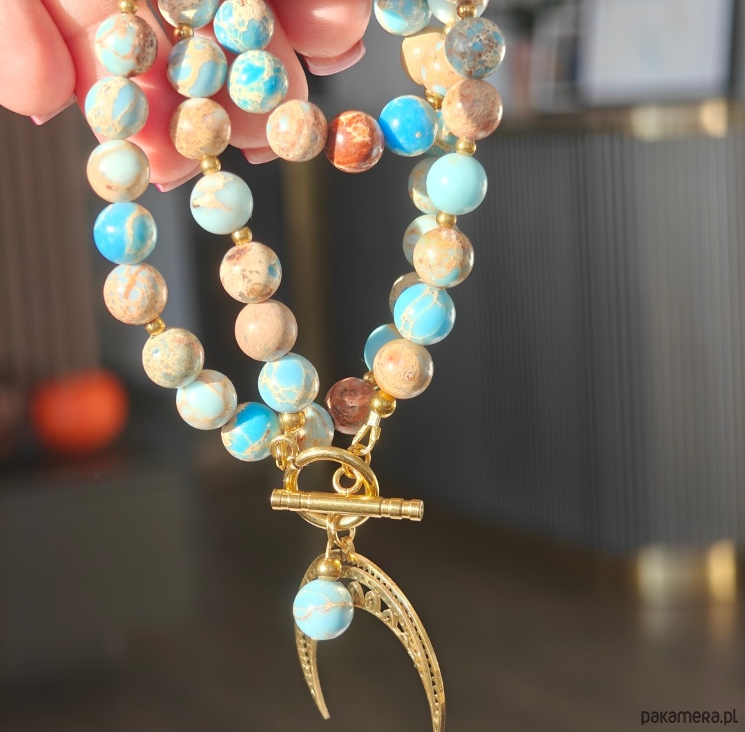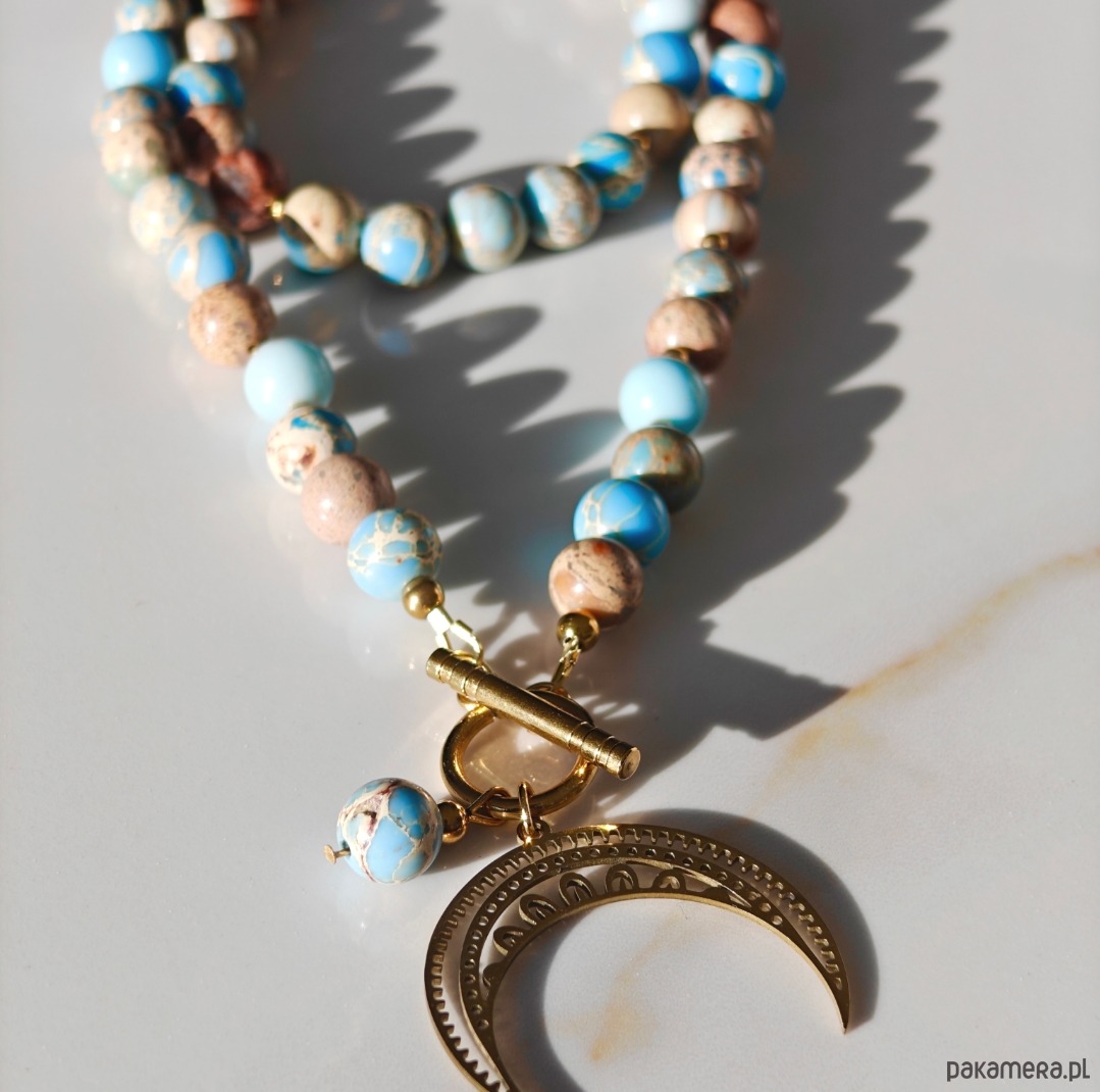 Naszyjnik wykonany z jaspisu o średnicy 8 mm w wyjątkowej palecie barw — połączeniu delikatnych odcieni niebieskiego z beżowo-brązowymi tonami. Kamienie tworzą naturalną, harmonijną kompozycję, dzięki której naszyjnik przyciąga uwagę spokojnym, ziemistym charakterem.