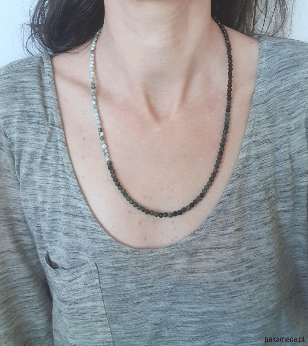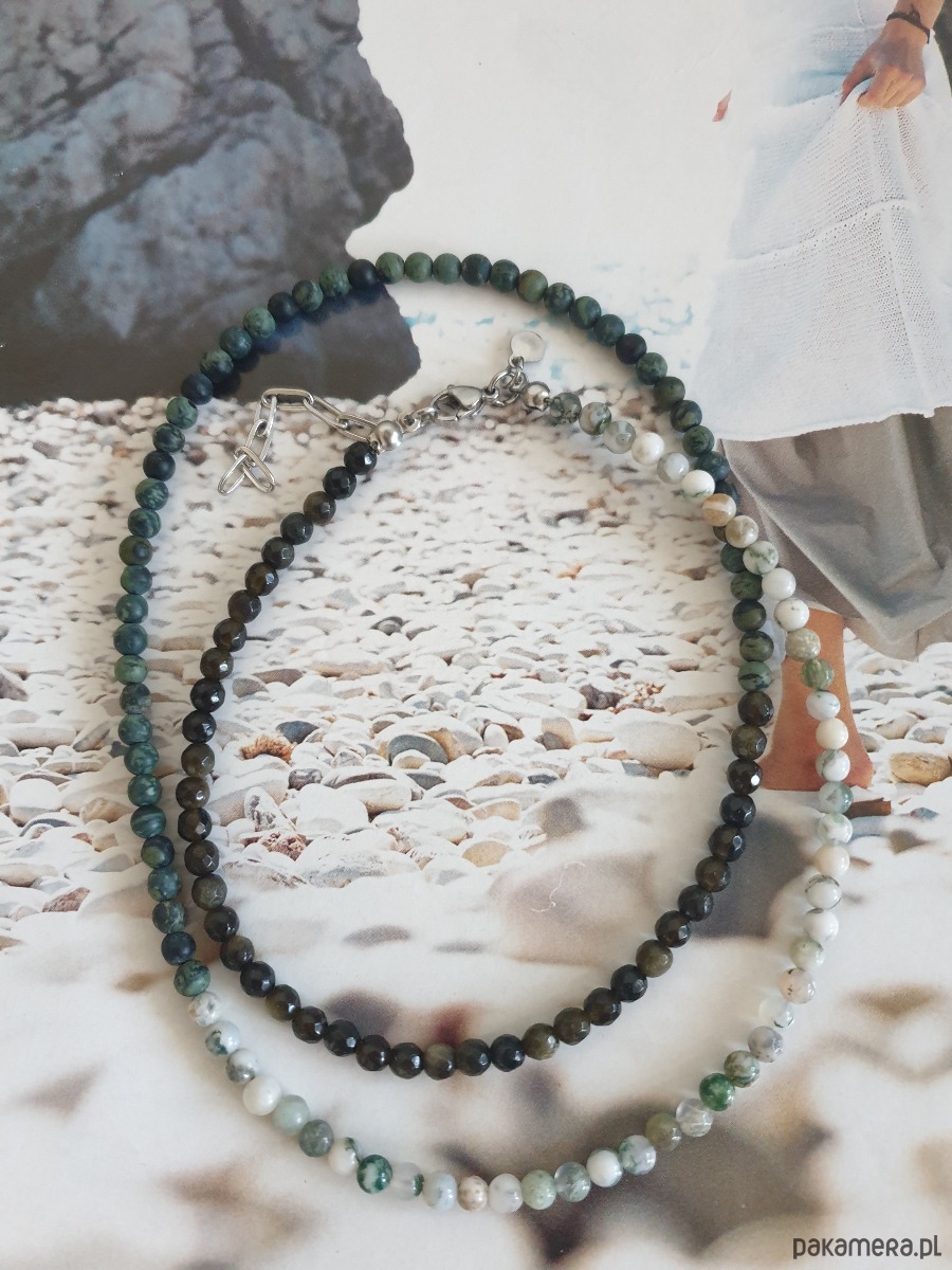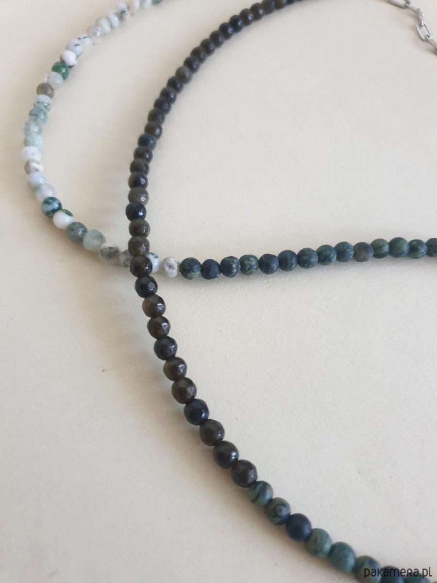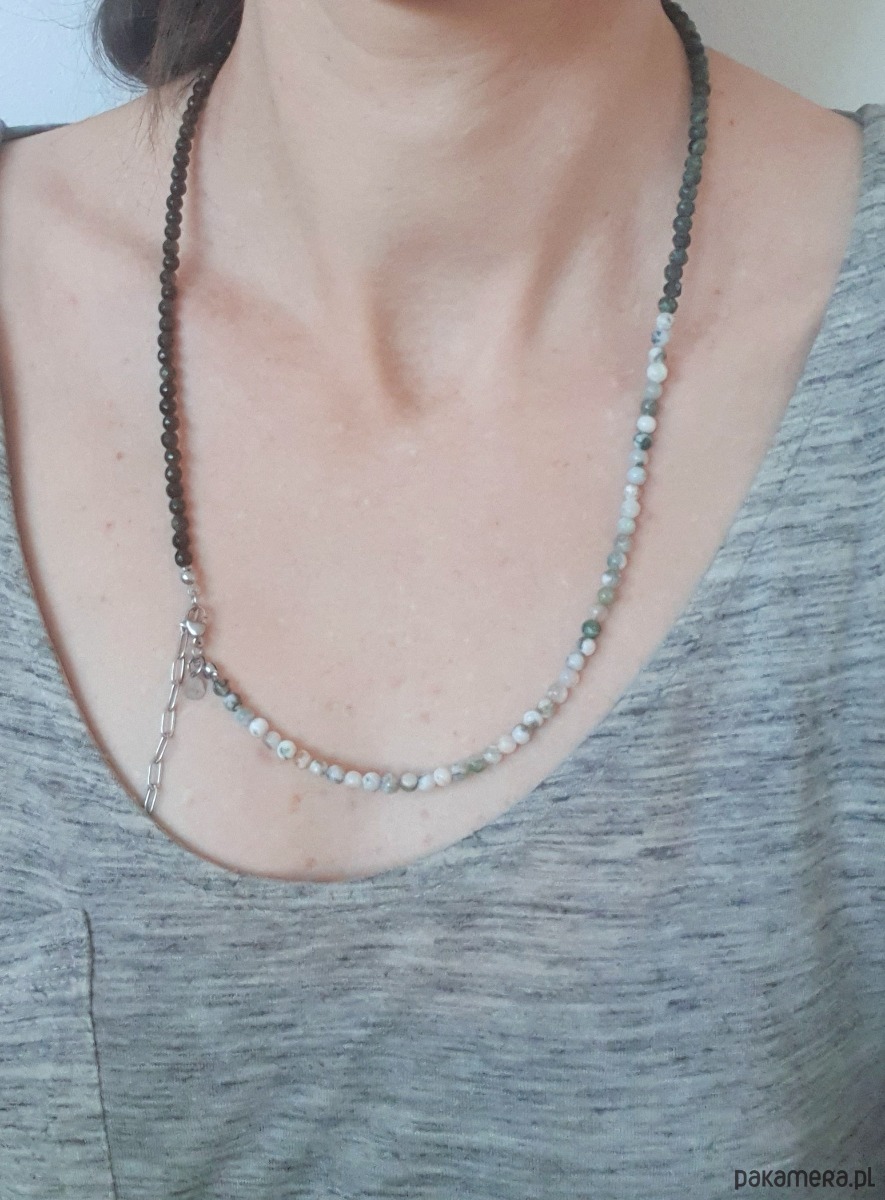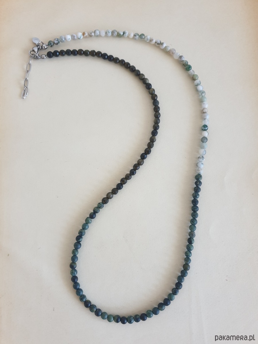 Minimalistyczny delikatny dłuższy naszyjnik z kolekcji ROOTS w kolorach ciemnej zieleni, szarości, czarnego, bieli. Tworzony ręcznie z kamieni naturalnych, elementów ze stali szlachetnej (antyalergicznej). Można go nosić też jako bransoletkę