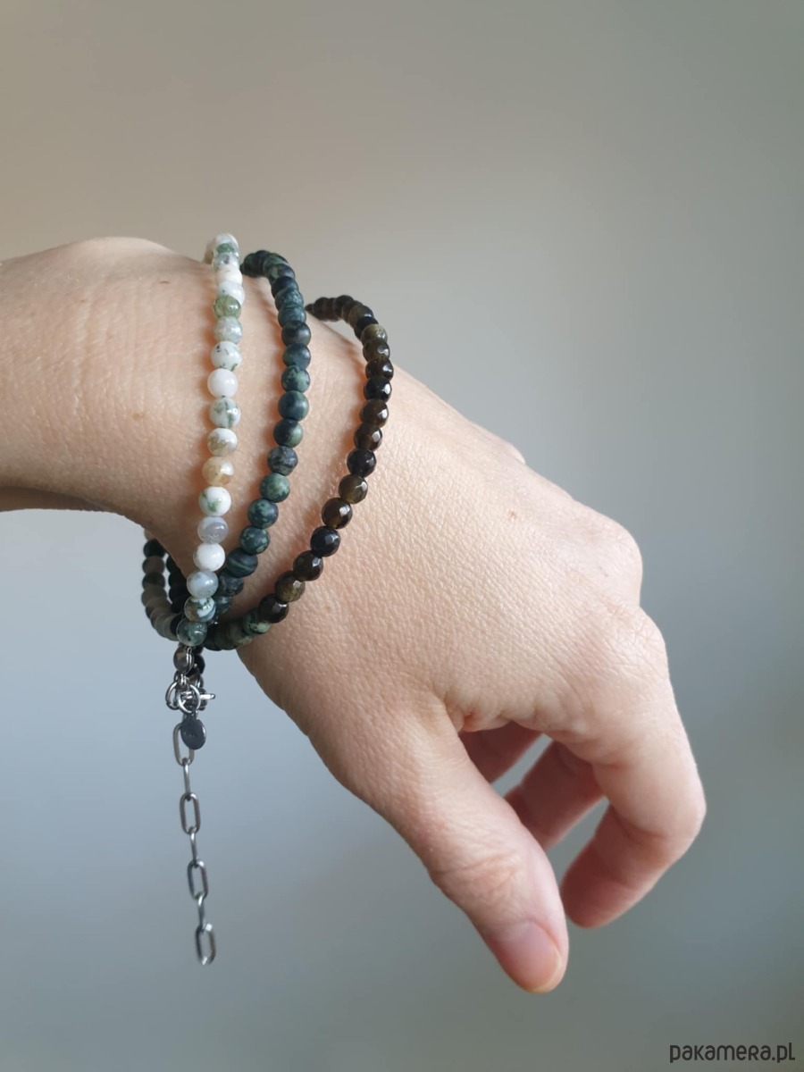Stal szlachetna (chirurgiczna) jest hipoalergiczna, nie zmienia koloru, bardzo wytrzymała. Swoją biżuterię ze stali i kamieni naturalnych możesz co jakiś czas przemyć w letniej wodzie z delikatnym mydłem i wysuszyć (tą z elementami z lnianego sznurka także)