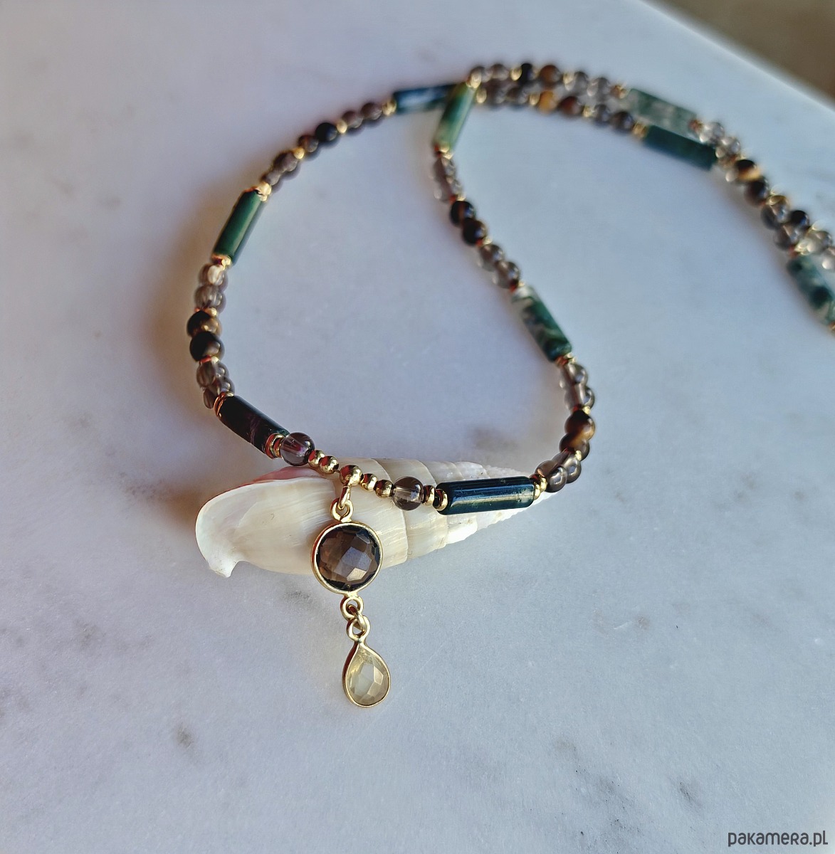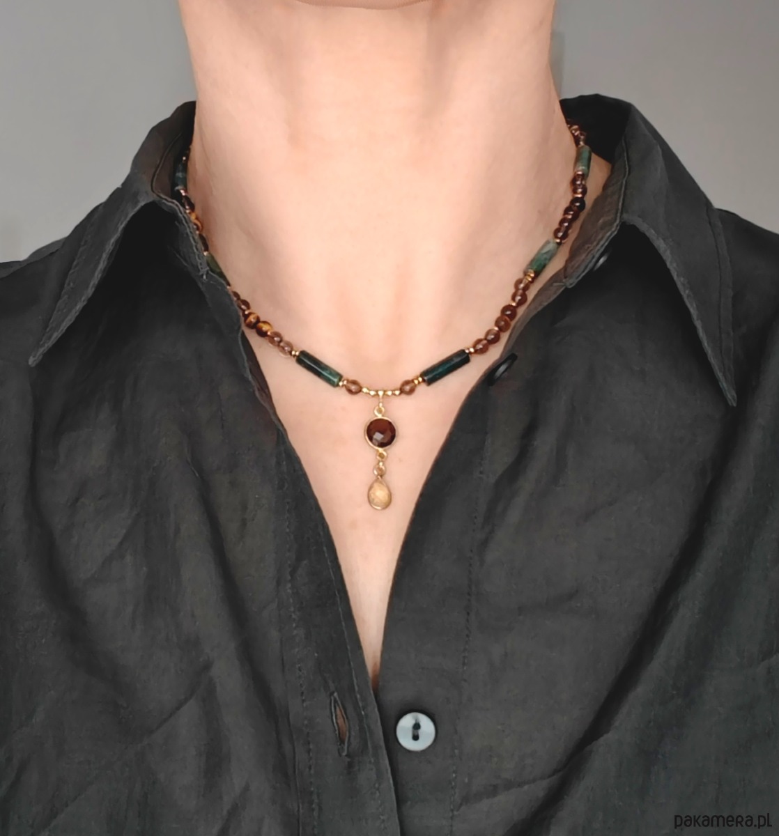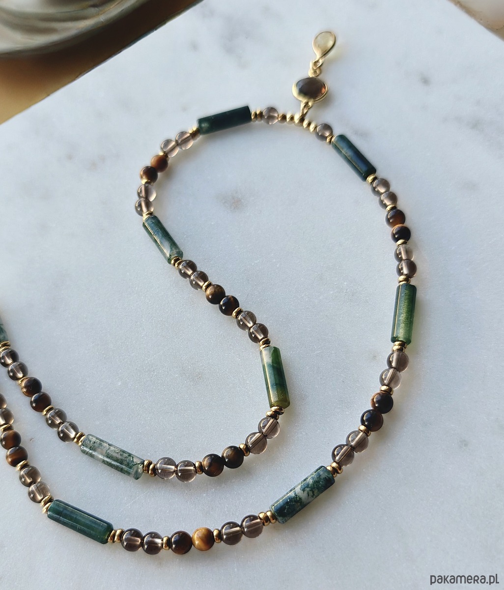 Spójny kolorystycznie i energetycznie naszyjnik z kamieni naturalnych: agatu mszystego, kwarcu dymnego i tygrysiego oka wzbogacony hematytem. W barwach lasu i ziemii. Zawieszka z cytrynem i kwarcem dymnym jest pięknym wykończeniem i ozdobą dekoltu. Wykorzystane kamienie cytrynu i oliwinu połączeniu z pirytem stanowią trio pomyślności - symbolizują bogactwo i dobrobyt.