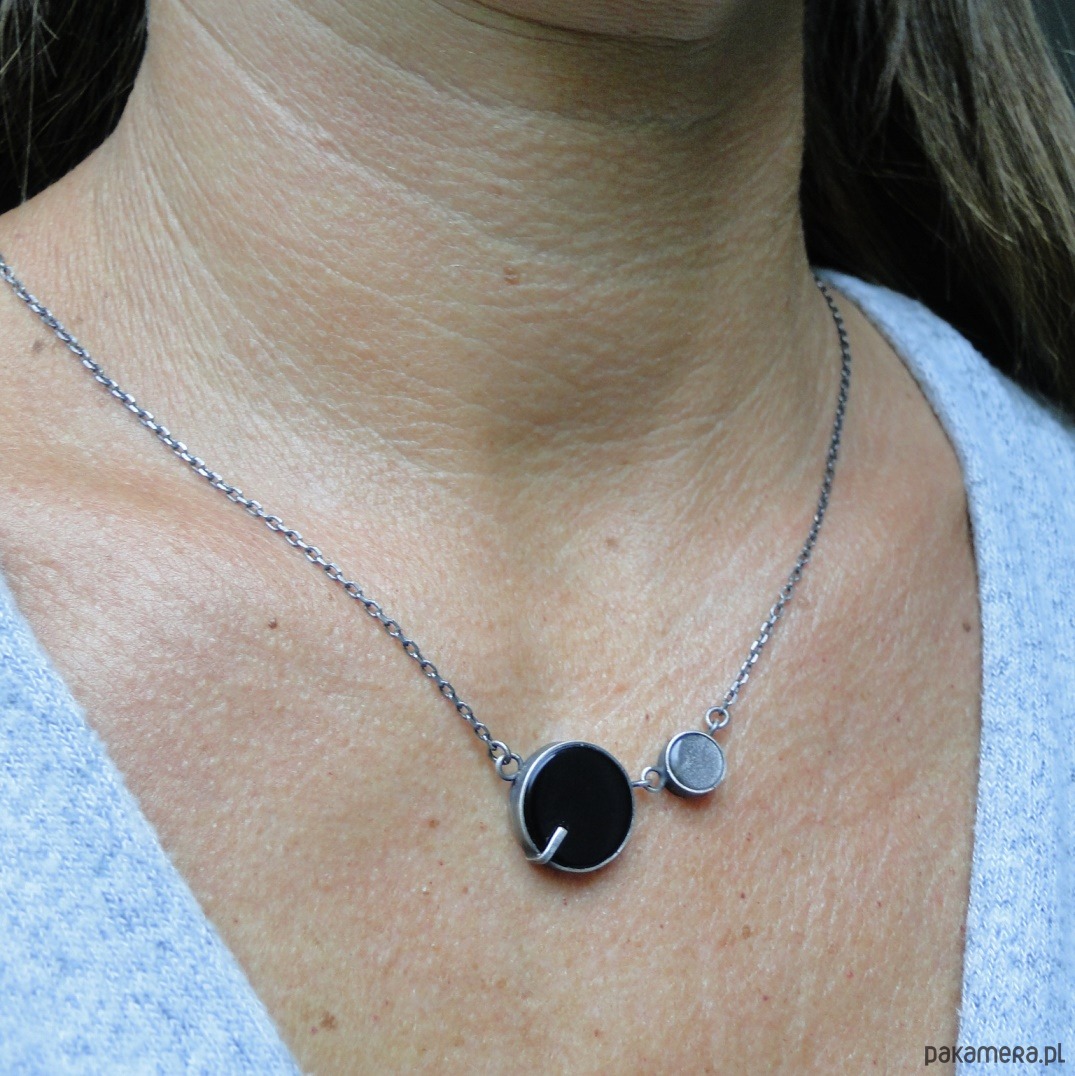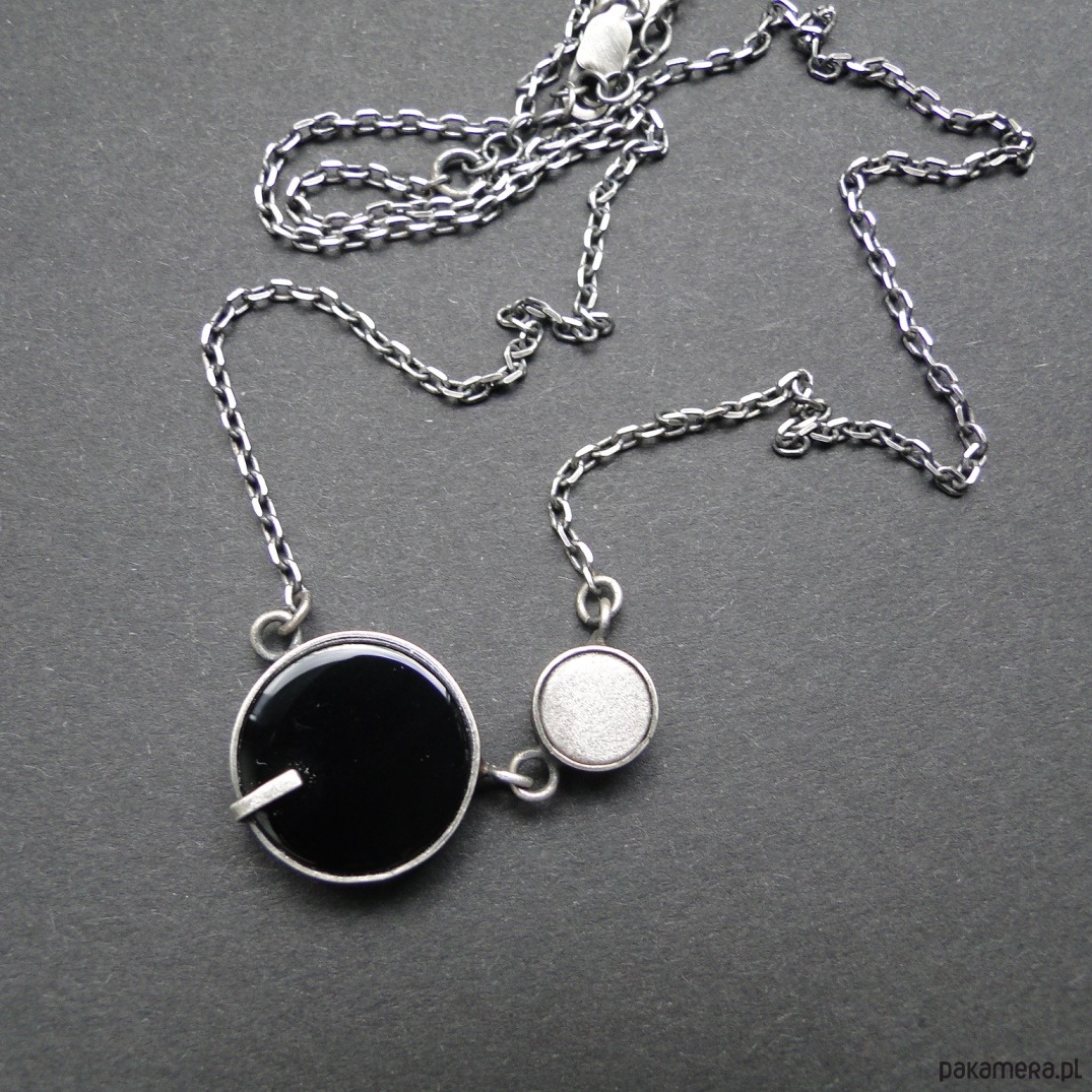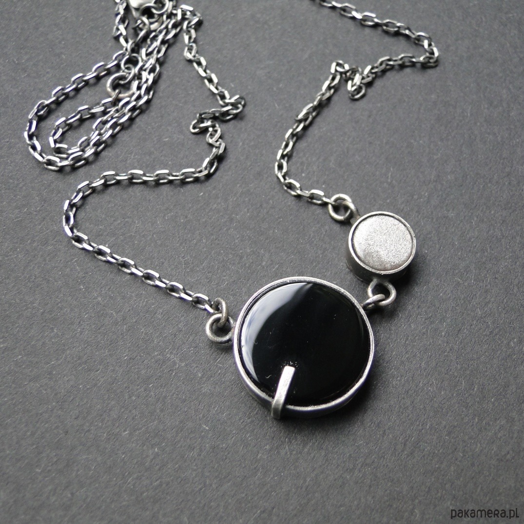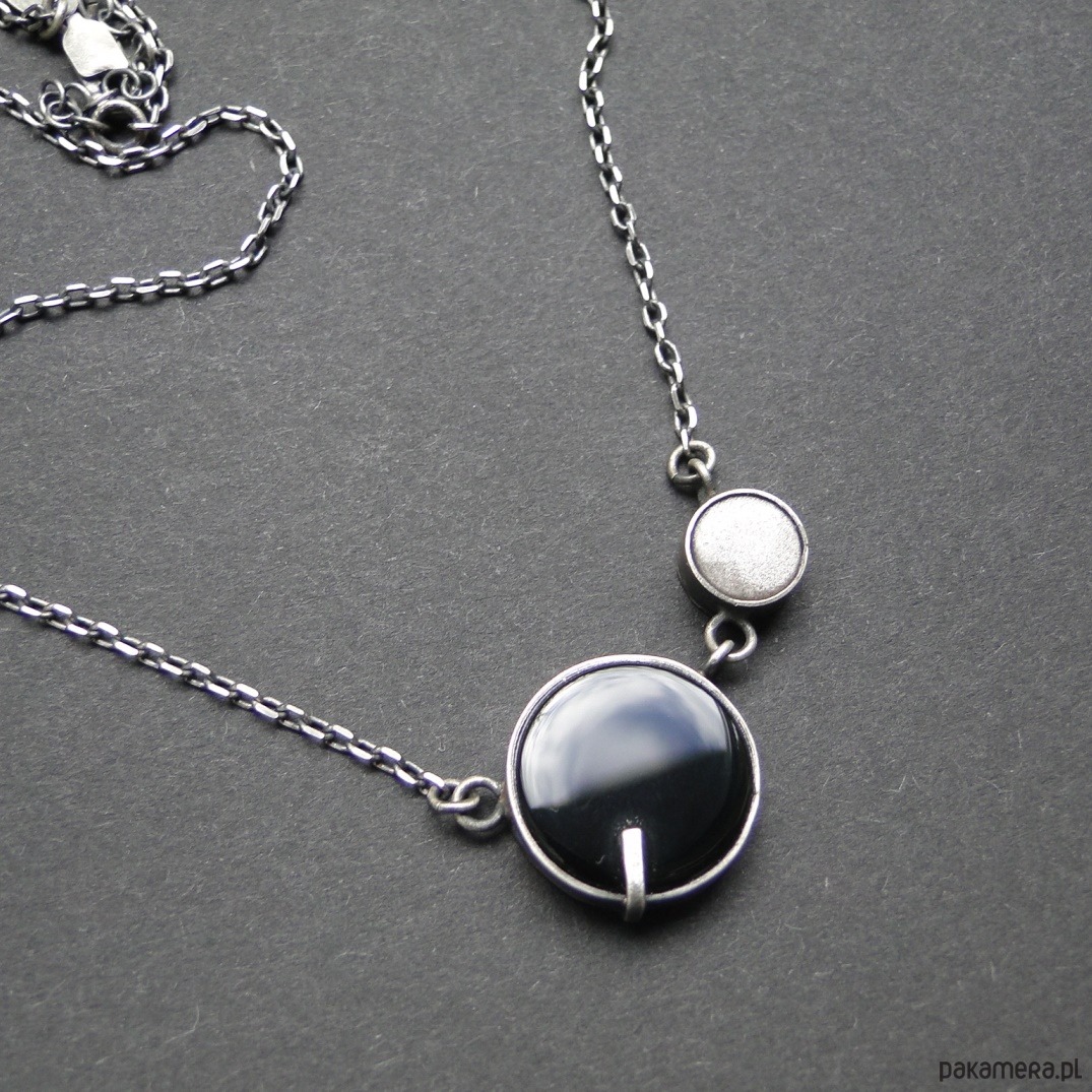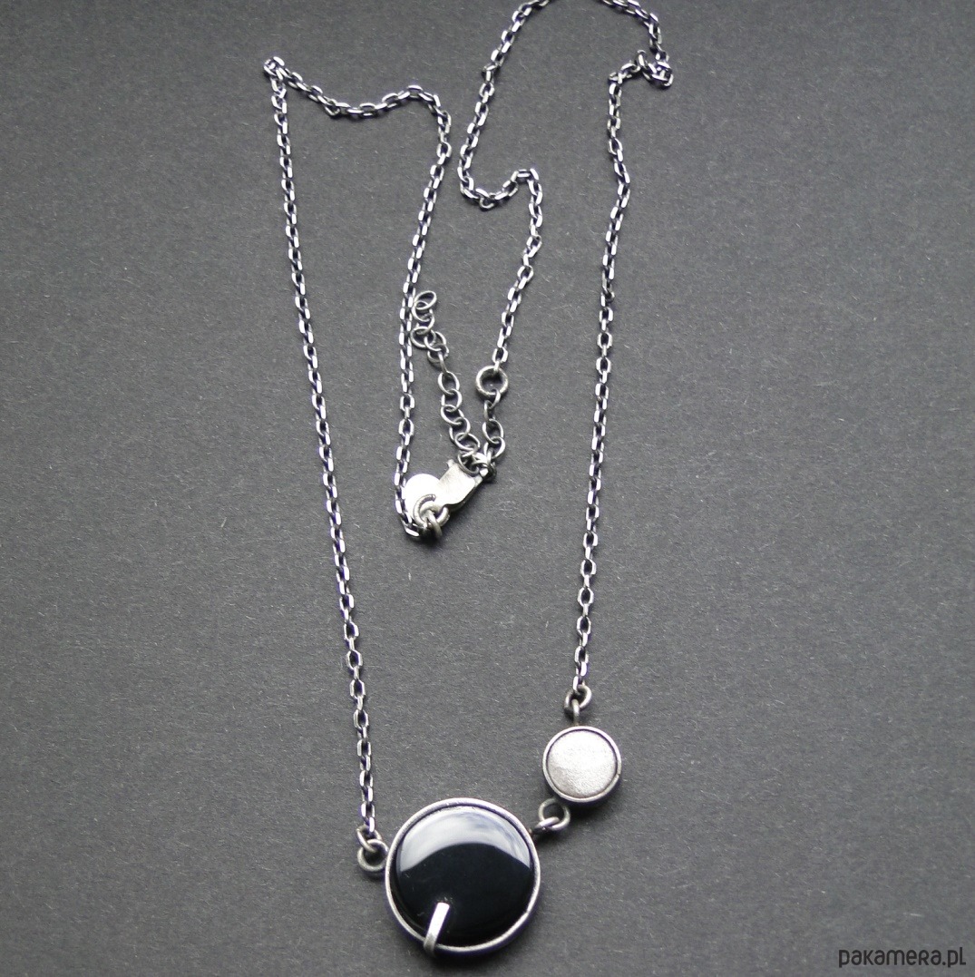 Surowy,krótki naszyjnik wykonany wg tradycyjnych technik jubilerskich.Srebro 925,oksydowane i szorowane. Kamienie: czarny onyks śr.16mm; piękny siwy obsydian śr.8 mm z polaryzacją. Obwód 46,5 cm plus 5 cm przedłużki. Nie moczyć w wodzie. Polecam pierścień i sztyfty do zestawu (jedyny egzemplarz).