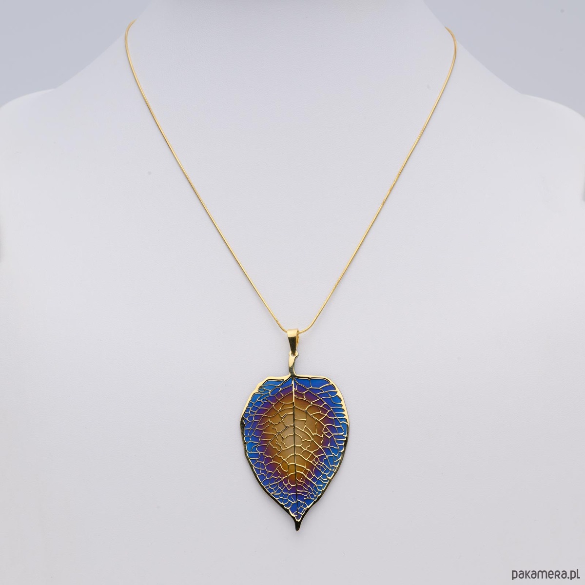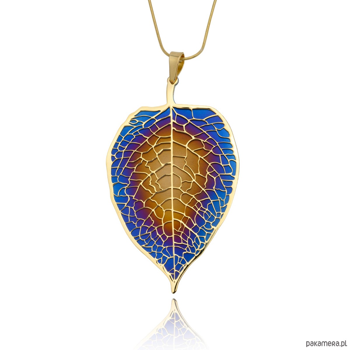 Naszyjnik - duży srebrny, pozłacany liść , listek z tytanu kolorowego