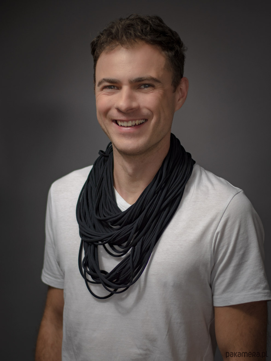 Niezwykle oryginalny, designerski naszyjnik - szal, wykonany z pasów dzianiny w kolorze czarnym. Można go nosić jak szalik lub używać jako element stylizacji. Możliwość zamówienia naszyjnika w innym kolorze. Proszę o wcześniejszy kontakt.