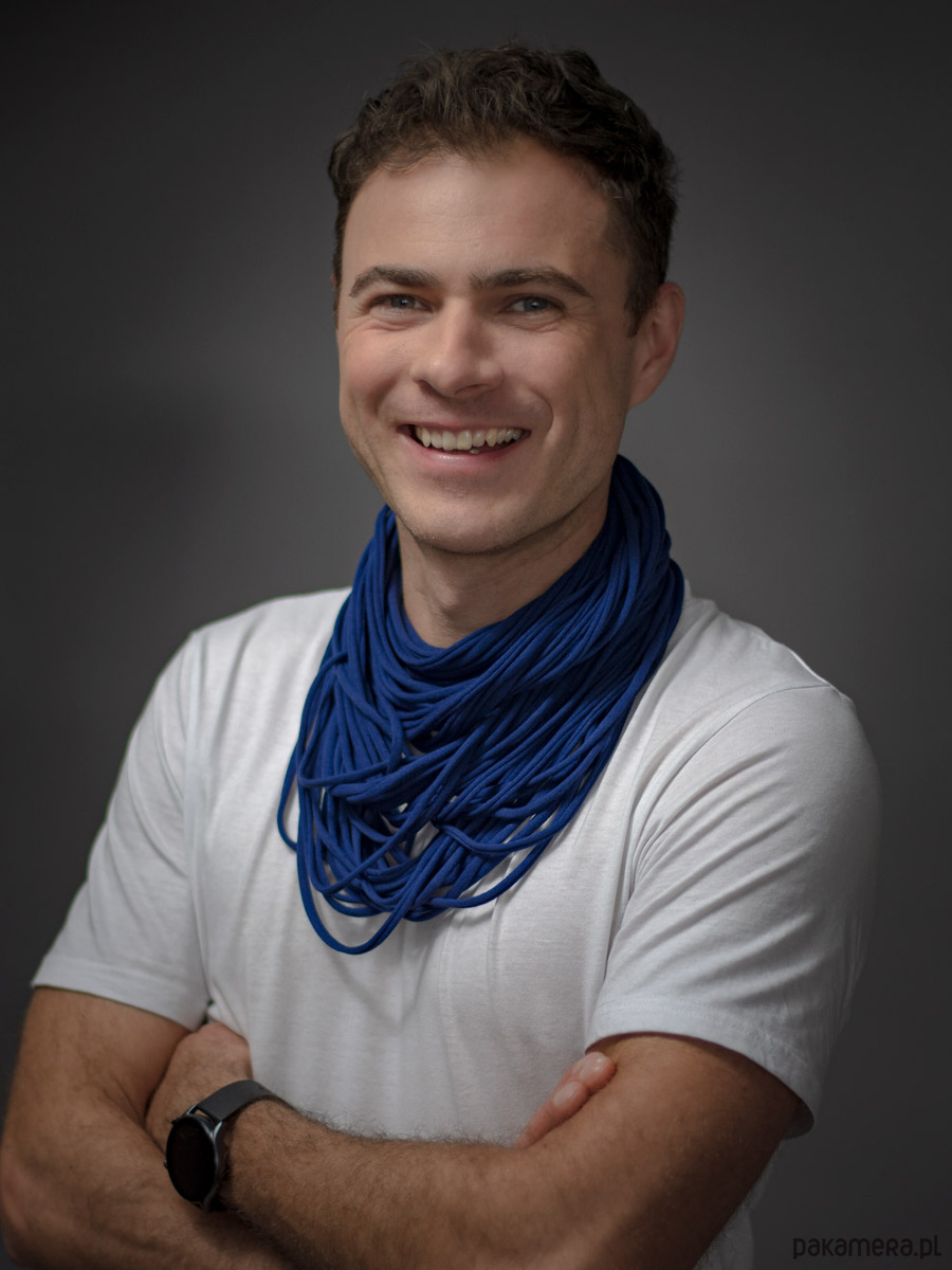 Niezwykle oryginalny, designerski naszyjnik - szal, wykonany z pasów dzianiny w kolorze granatowym. Można go nosić jak szalik lub używać jako element stylizacji. Możliwość zamówienia naszyjnika w innym kolorze. Proszę o wcześniejszy kontakt.