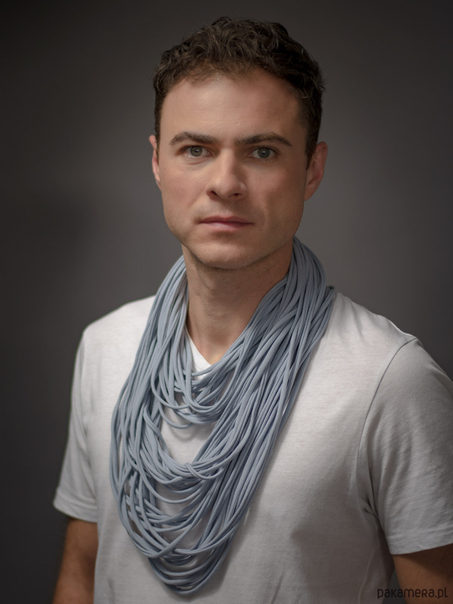 Niezwykle oryginalny, designerski naszyjnik - szal, wykonany z pasów dzianiny w kolorze szarym. Można go nosić jak szalik lub używać jako element stylizacji. Możliwość zamówienia naszyjnika w innym kolorze. Proszę o wcześniejszy kontakt.