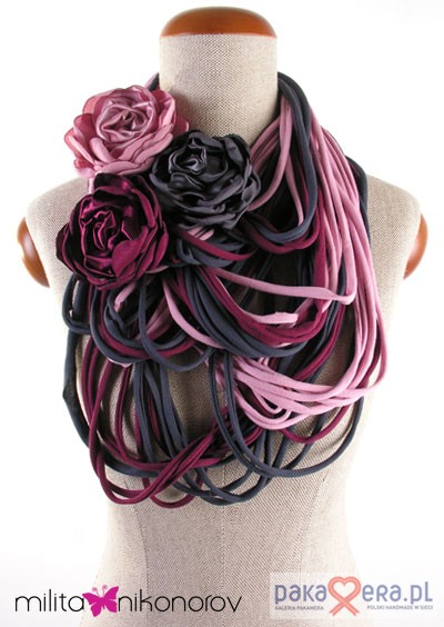 Oryginalny, designerski naszyjnik - szal, wykonany z pasów dzianiny w kolorze grafitowym, bordowym i pudrowego różu. Można go nosić jak szalik lub używać jako element stylizacji. W komplecie z 3 ręcznie wykonanymi broszkami w kolorach naszyjnika. Możliwość zamówienia naszyjnika w innym kolorze. Proszę o wcześniejszy kontakt