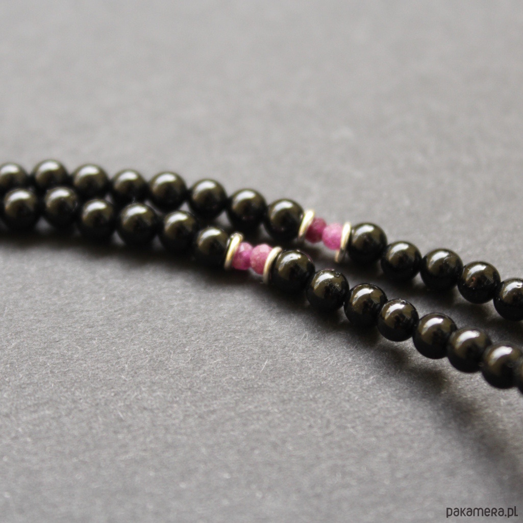 Unikatowy naszyjnik zostały wykonany z kuleczek onyksu wielkości 0,4 cm oraz fasetowanych rubinów wielkości 0,2 cm, a wykończony srebrnymi elementami.