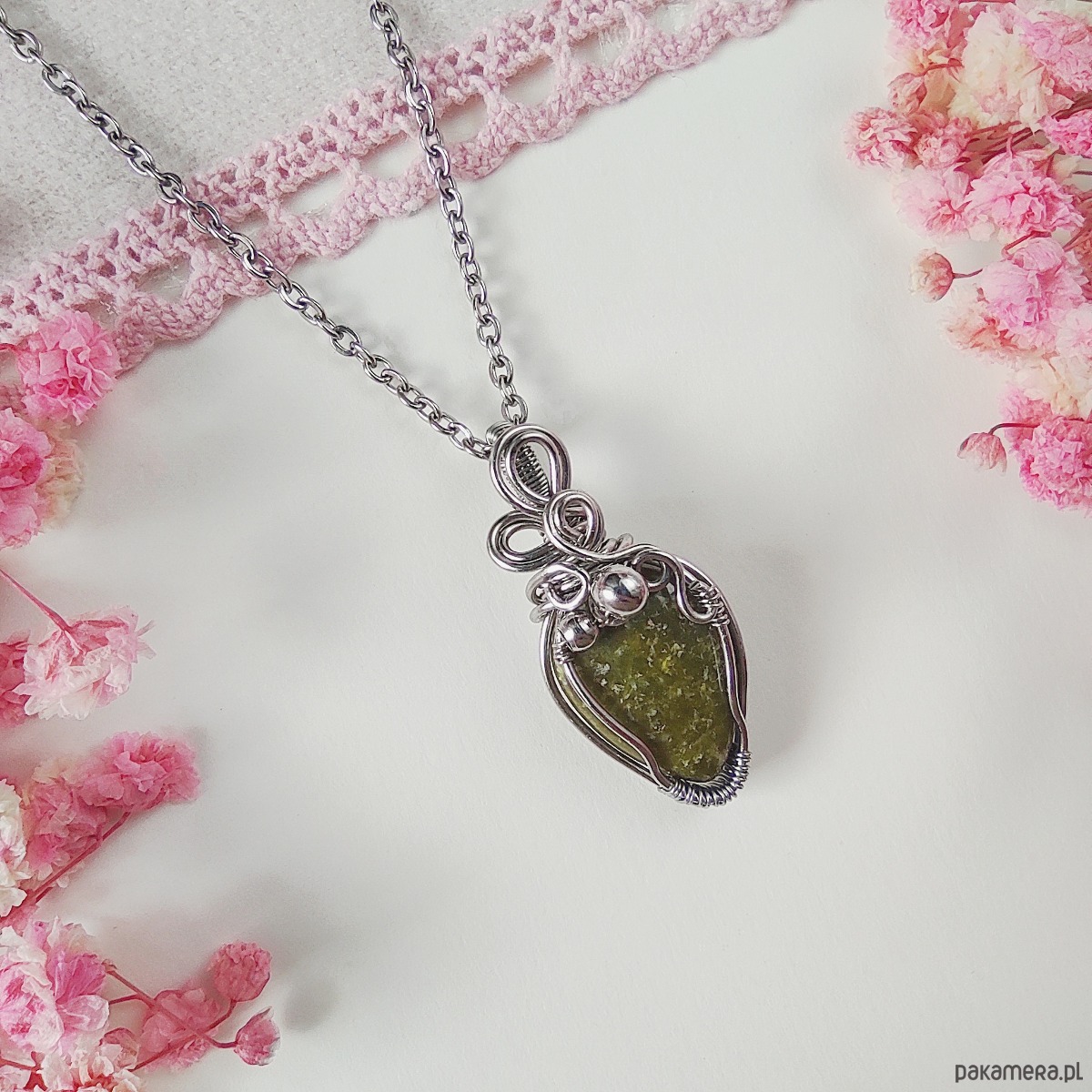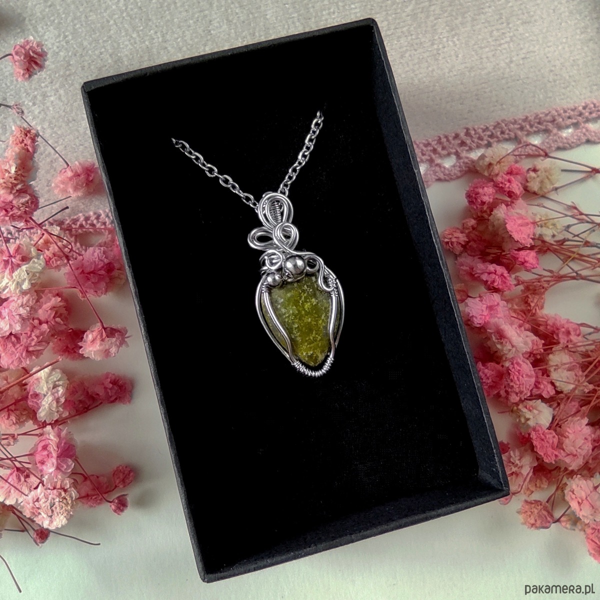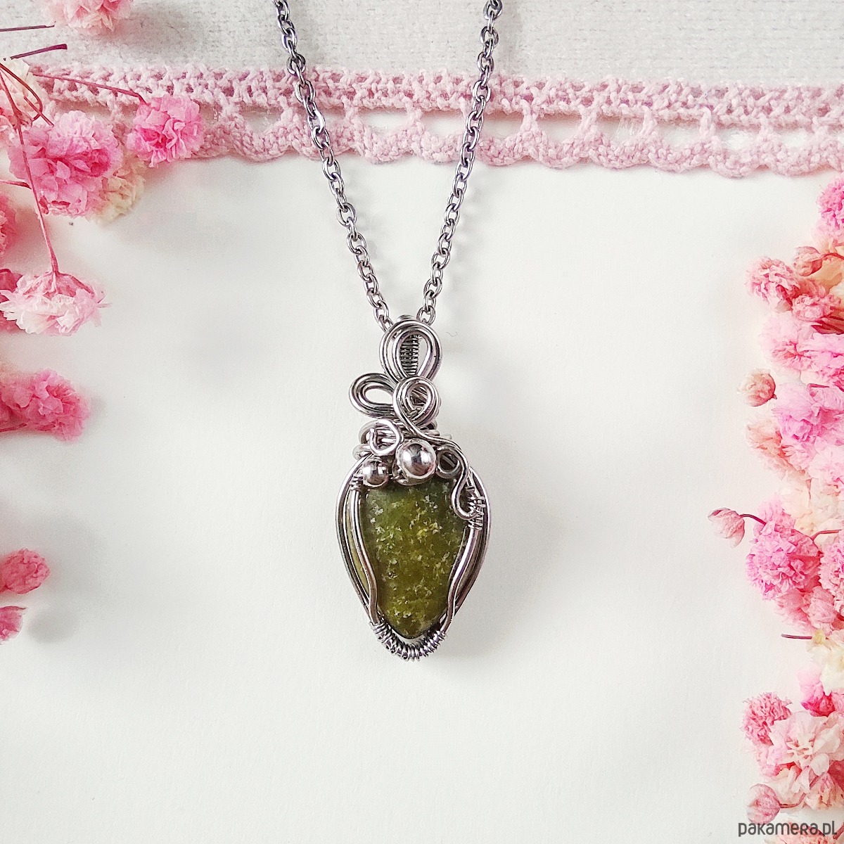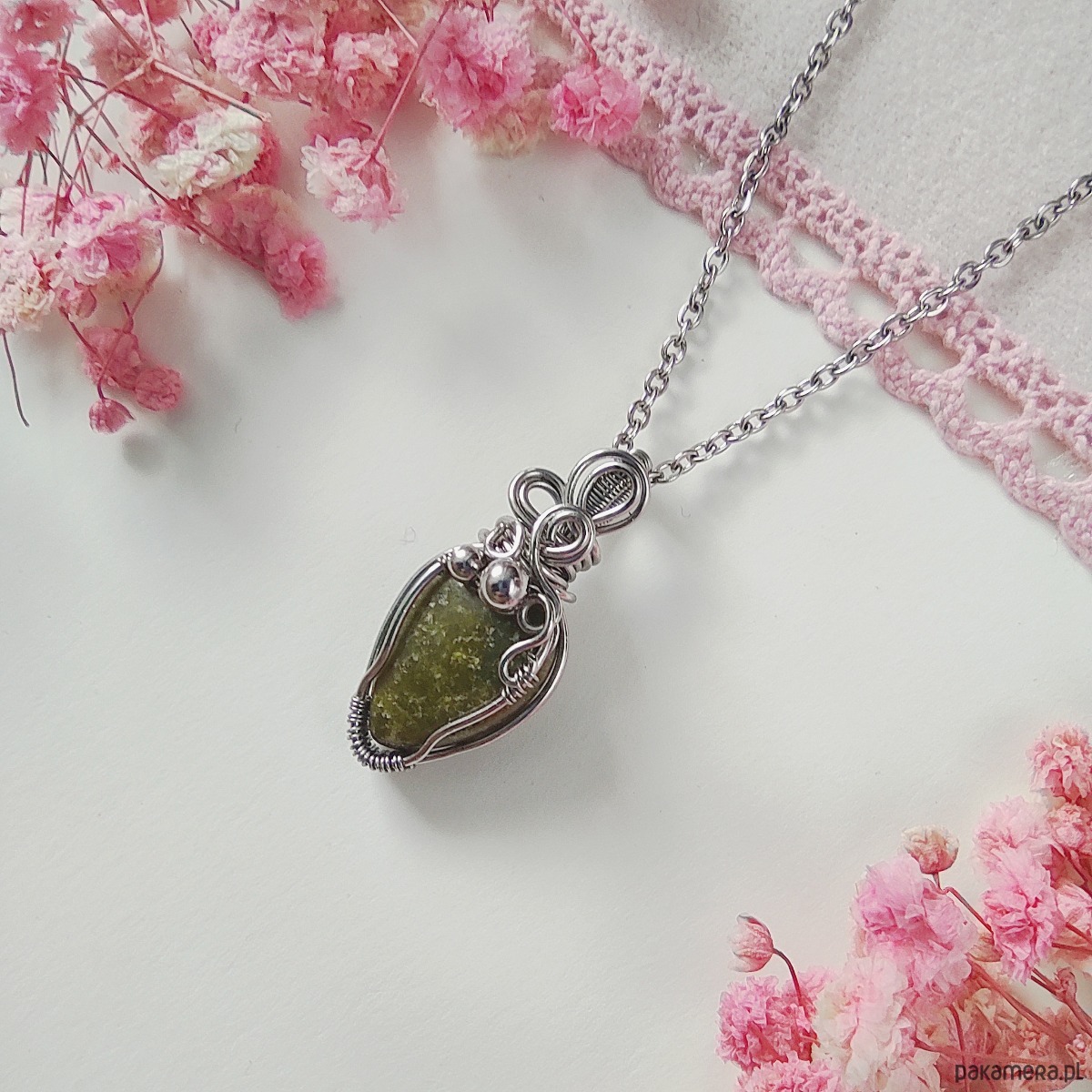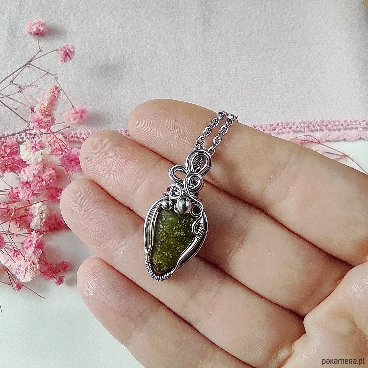 Naszyjnik z epidotem wykonany metodą wire wrapping to unikalna biżuteria handmade, która łączy w sobie elegancję i naturalne piękno kamieni. Kamień epidot został ręcznie opleciony w misterną kompozycję ze stali chirurgicznej, dzięki czemu całość prezentuje się niezwykle stylowo i trwałe rozwiązanie zostało zapewnione. Każdy detal został wykonany ręcznie, dlatego każdy naszyjnik jest niepowtarzalny i jedyny w swoim rodzaju.