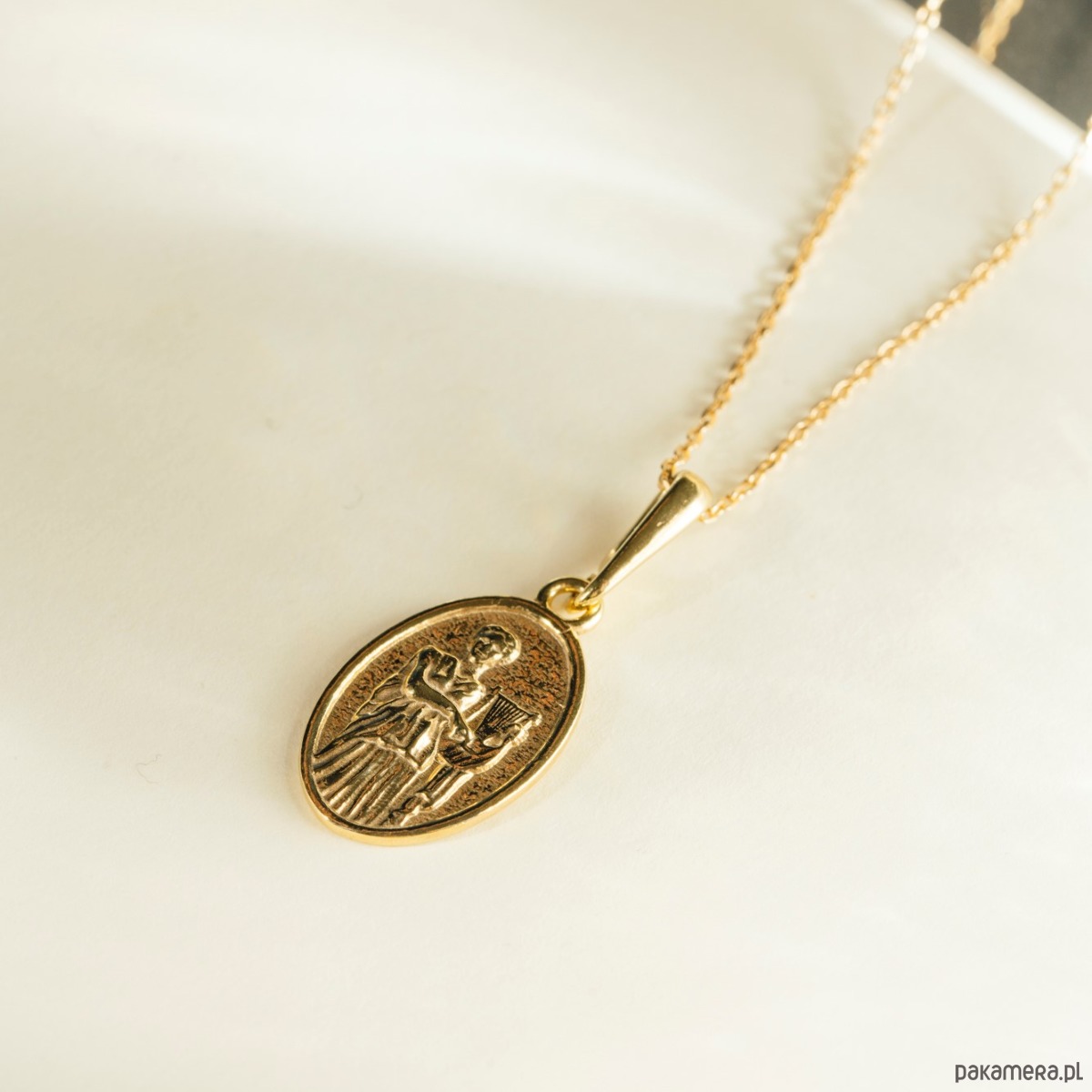 medalika z wizerunkiem muzy Erato – wymiary 2 x 1,4 cm , waga 2 gramy. Produkt wykonano ze srebra próby 925 i pozłocono.