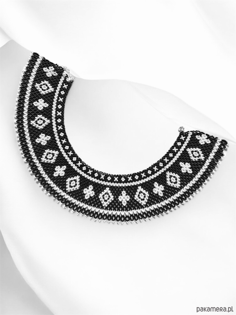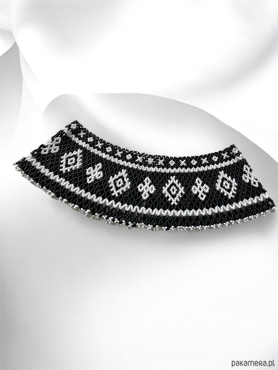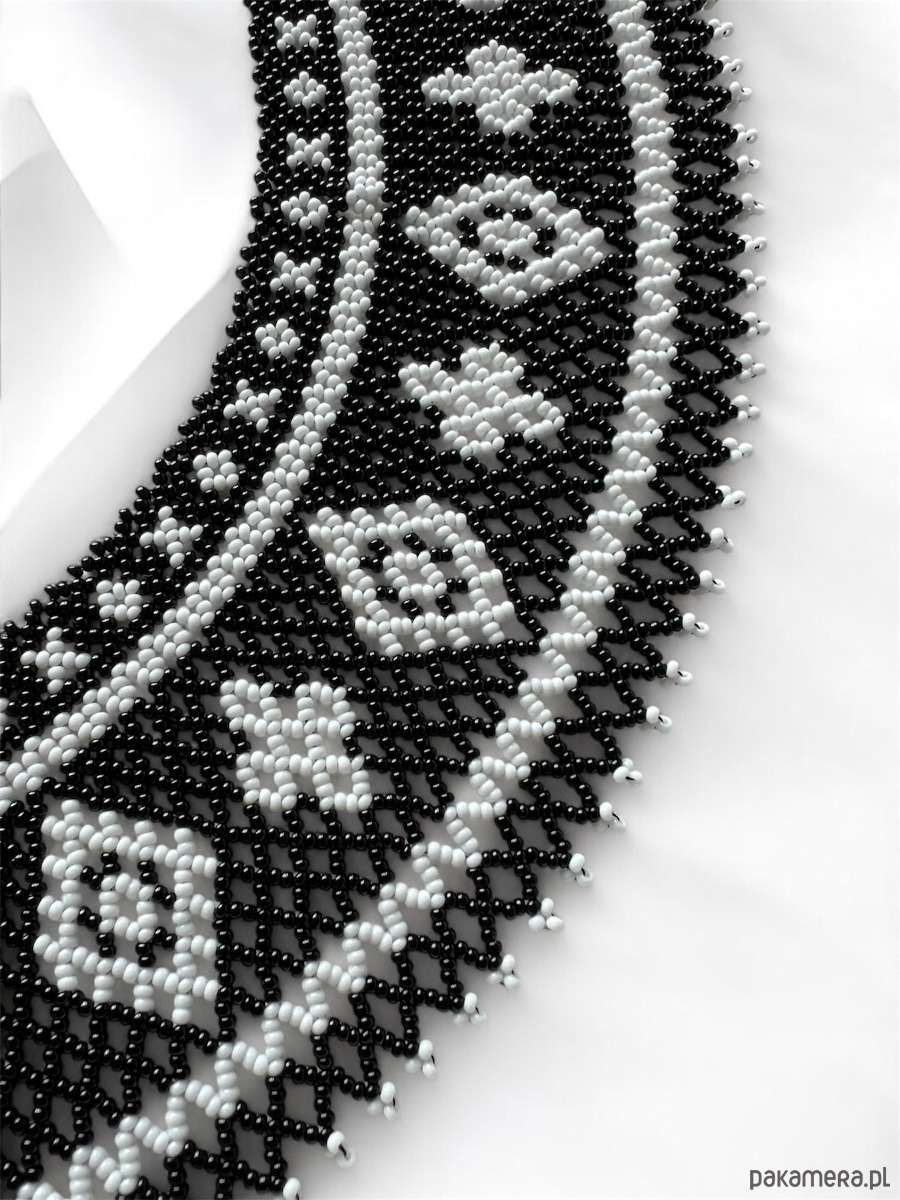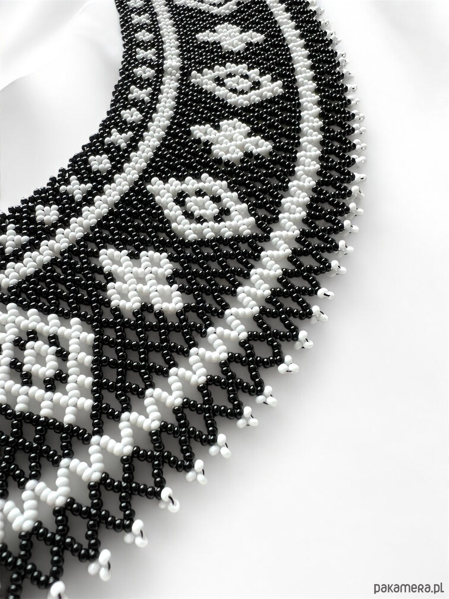 Naszyjnik wyróżnia się kontrastowym, monochromatycznym wzorem w czerni i bieli, inspirowanym tradycyjną sztuką ludową. Doskonale wpisuje się w styl boho, etno i gotycki, a zarazem podkreśla elegancję klasycznego retro looku. To biżuteria, która przyciąga wzrok i świetnie komponuje się zarówno z prostymi stylizacjami, jak i bardziej artystycznymi kreacjami.