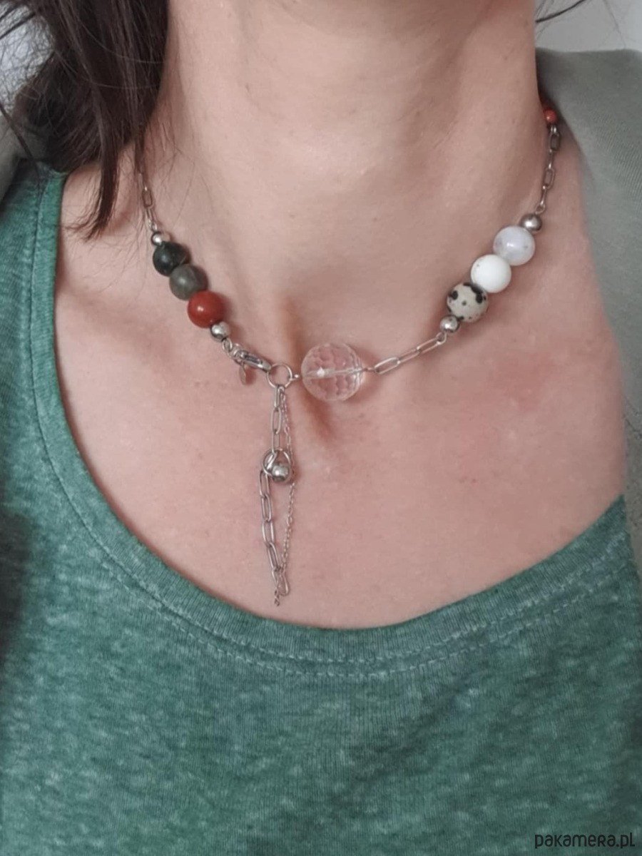 Minimalistyczny delikatny naszyjnik choker z kolekcji FANABERIA, z kamieniami naturalnymi w kolorach: czerwień, zieleń, biały, szary. Duża fasetowana kulka kryształ górski, mniejsze kulki jaspis czerwony, jaspis kambaba, jaspis dalmatyński, labradoryt, howlit, kamień księżycowy, małe kulki jaspis czerwony, łańcuch i elementy zapięcia ze stali szlachetnej (antyalergicznej) Naszyjnik idealnie pasuje do eleganckiej sukienki ale tez dobrze wygląda z t-shirtem, można sobie doczepiać do niego różne wisiorki, łańcuszki według wyobraźni.