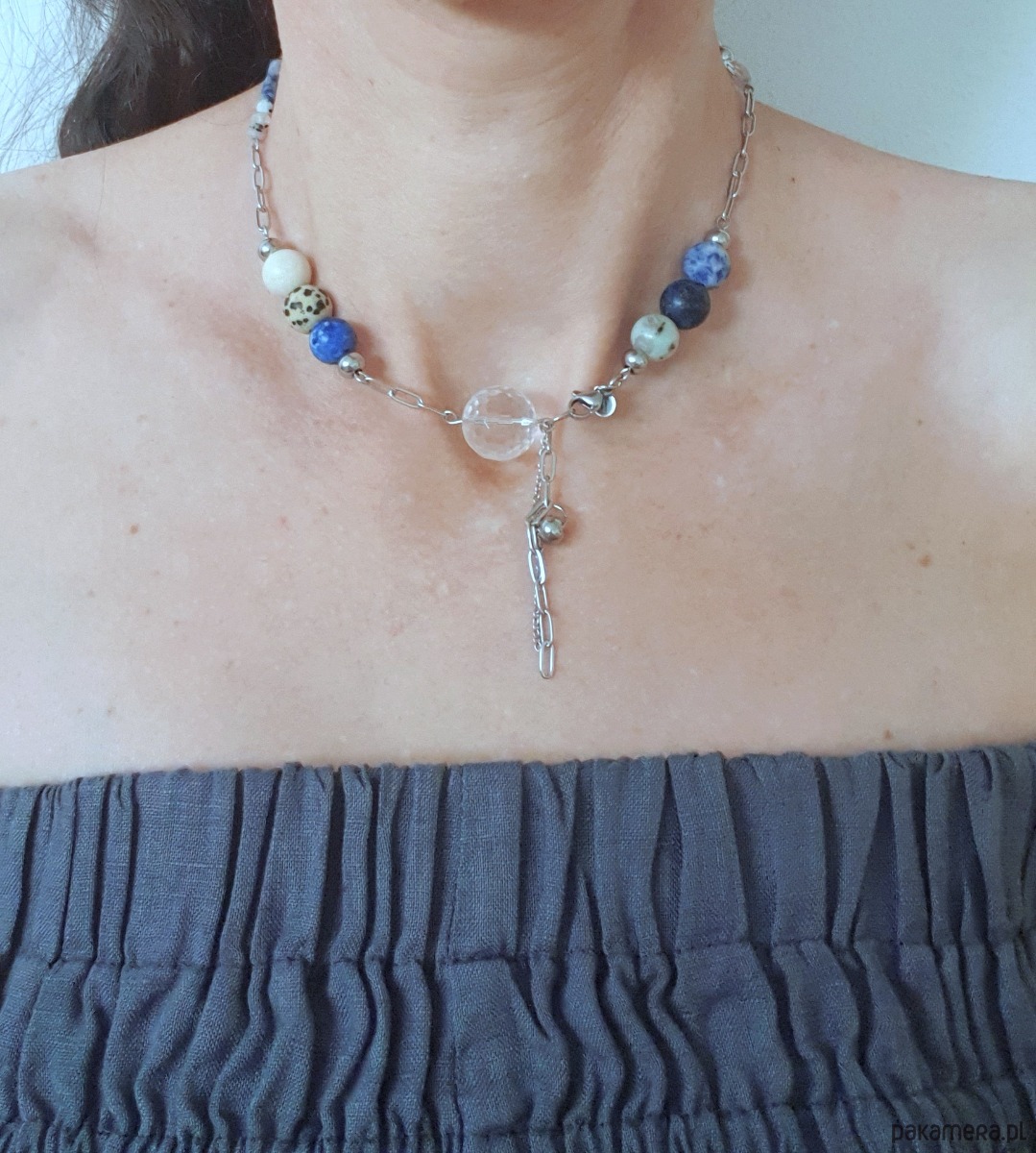 Minimalistyczny delikatny naszyjnik choker z kolekcji FANABERIA z kamieniami naturalnymi w kolorach: granat, niebieski. Duża fasetowana kulka kryształ górski, mniejsze kulki lapis lazuli, jaspis niebieski, jaspis lotus, jaspis dalmatyński, kamien rzeczny, małe kulki kamień księżycowy, łańcuch i elementy zapięcia ze stali szlachetnej (antyalergicznej) Naszyjnik idealnie pasuje do eleganckiej sukienki ale tez dobrze wygląda z t-shirtem, można sobie doczepiać do niego różne wisiorki, łańcuszki według wyobraźni.