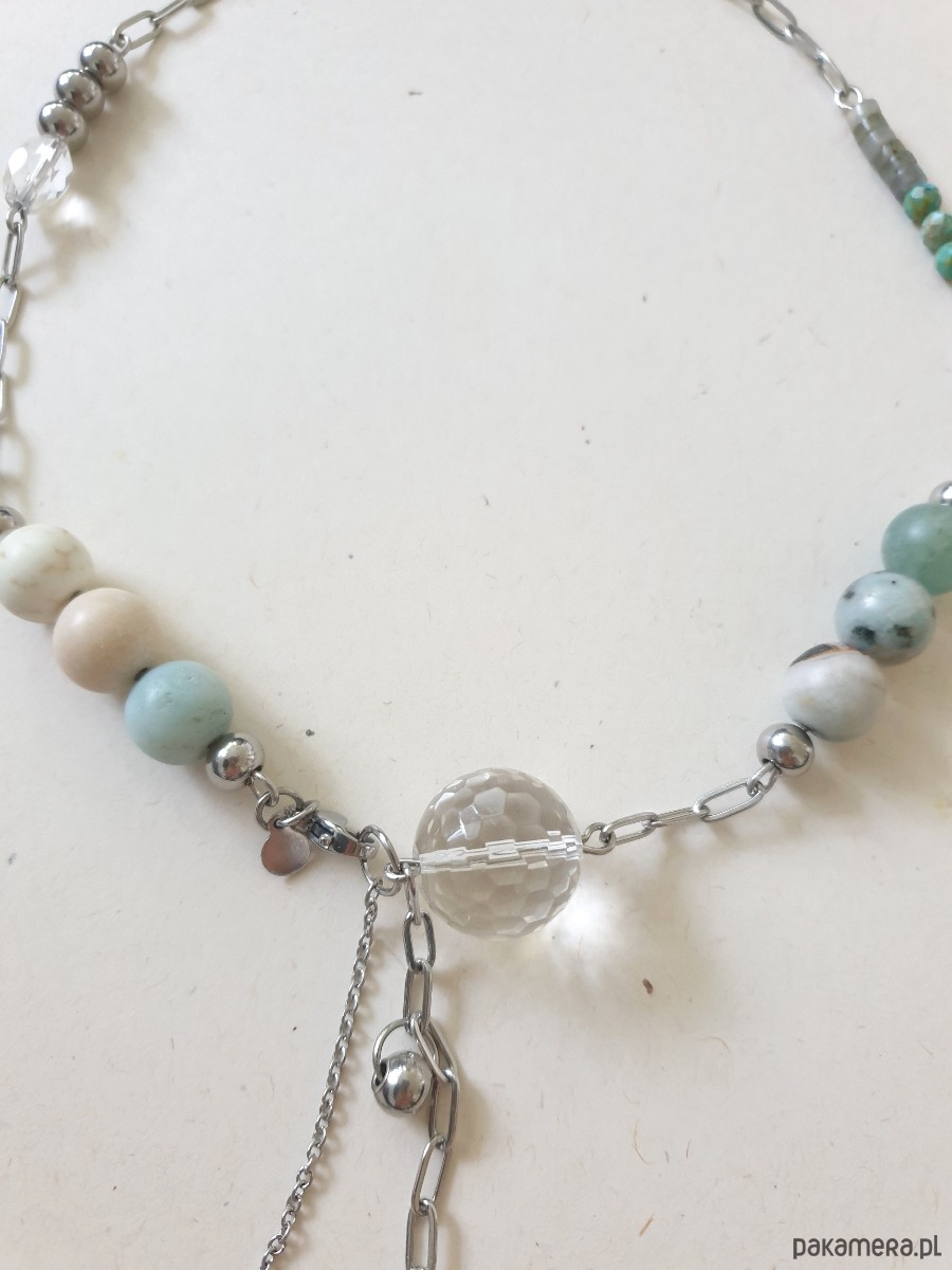 Minimalistyczny delikatny naszyjnik choker z kolekcji FANABERIA z kamieniami naturalnymi w kolorach: blade turkusy. Duża fasetowana kulka kryształ górski, mniejsze kulki howlit kremowy, amazonit, akwamaryn, jaspis lotus, kamien rzeczny, turkus, labradoryt, łańcuch i elementy zapięcia ze stali szlachetnej (antyalergicznej) Naszyjnik idealnie pasuje do eleganckiej sukienki ale tez dobrze wygląda z t-shirtem, można sobie doczepiać do niego różne wisiorki, łańcuszki według wyobraźni. Na zdjęciu przykładowy naszyjnik, tworzę je na zamówienie z tych samych kamieni, w tej samej tonacji jednak będą się minimalnie różnić bo każdy kamień jest wyjątkowy.