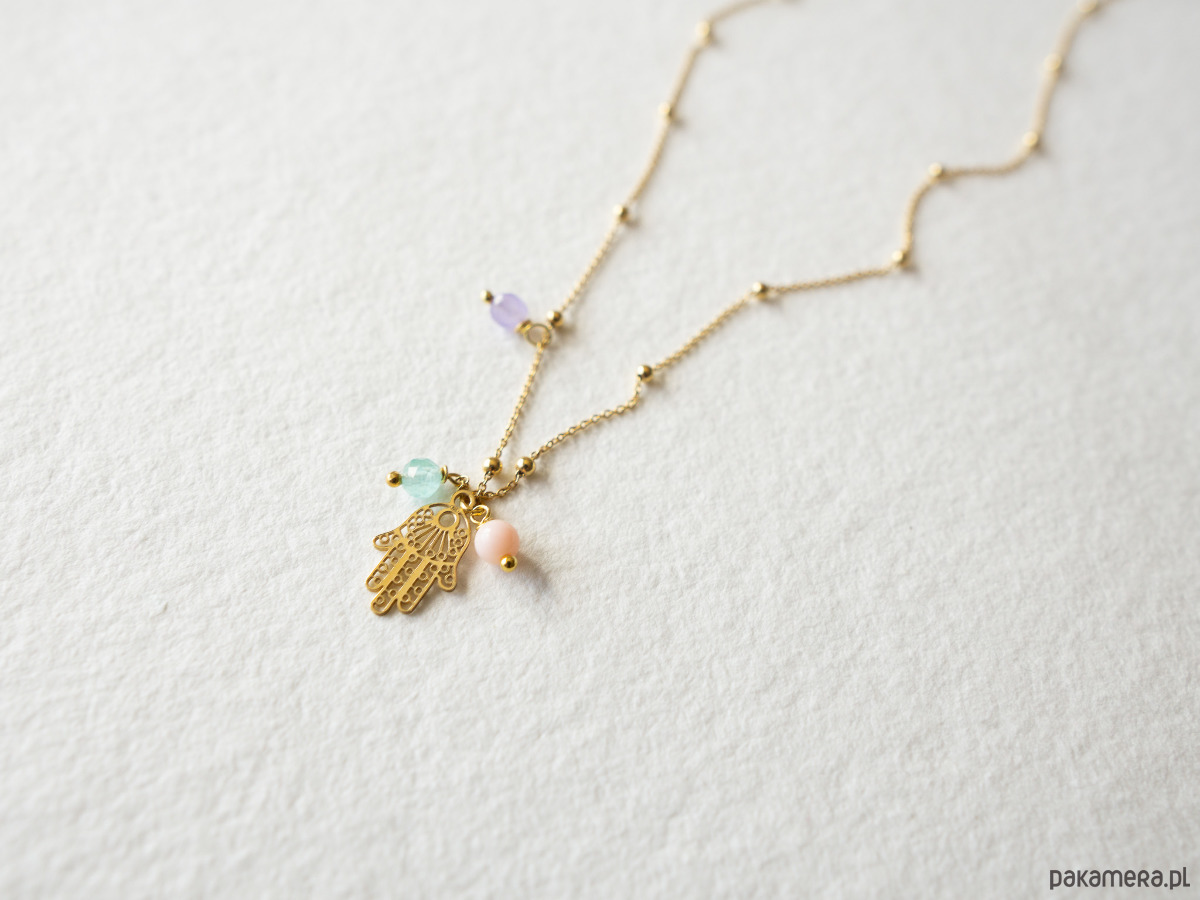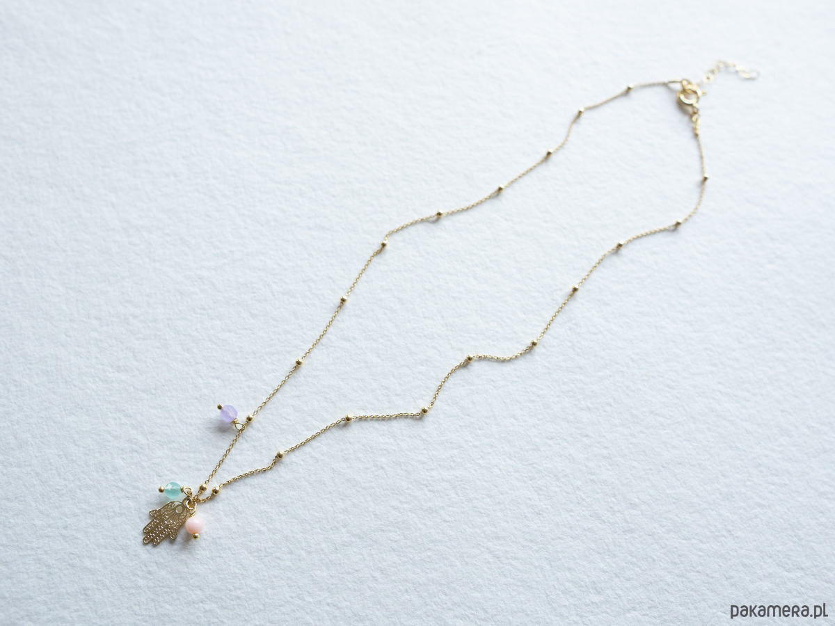 Złoty łańcuszek z zawieszką Ręka Fatimy, z kamieniami. Złote elementy wykonane z wysokiej jakości srebra próby 925, pozłacanego 24-karatowym złotem.