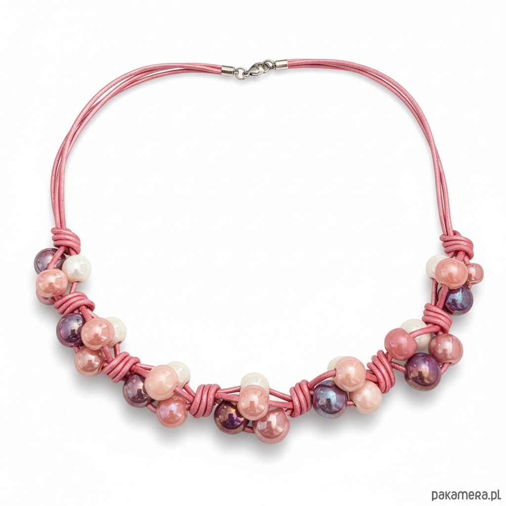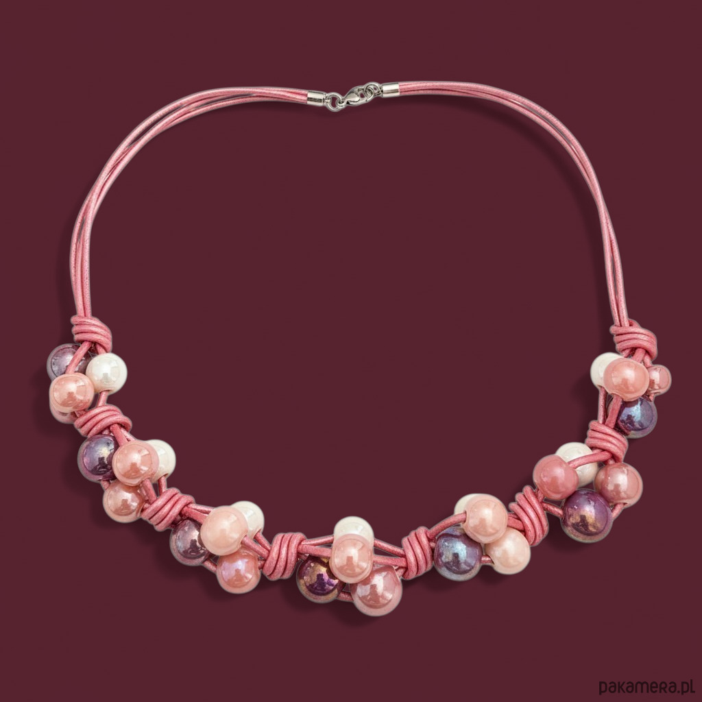 Naszyjnik wykonany z kulek ceramicznych w odcieniach różu i bieli, a także z okrągłych, barwionych rzemieni skórzanych. Ceramiczne kule mają średnicę od 8 do 14mm.