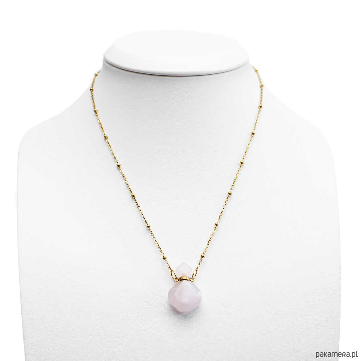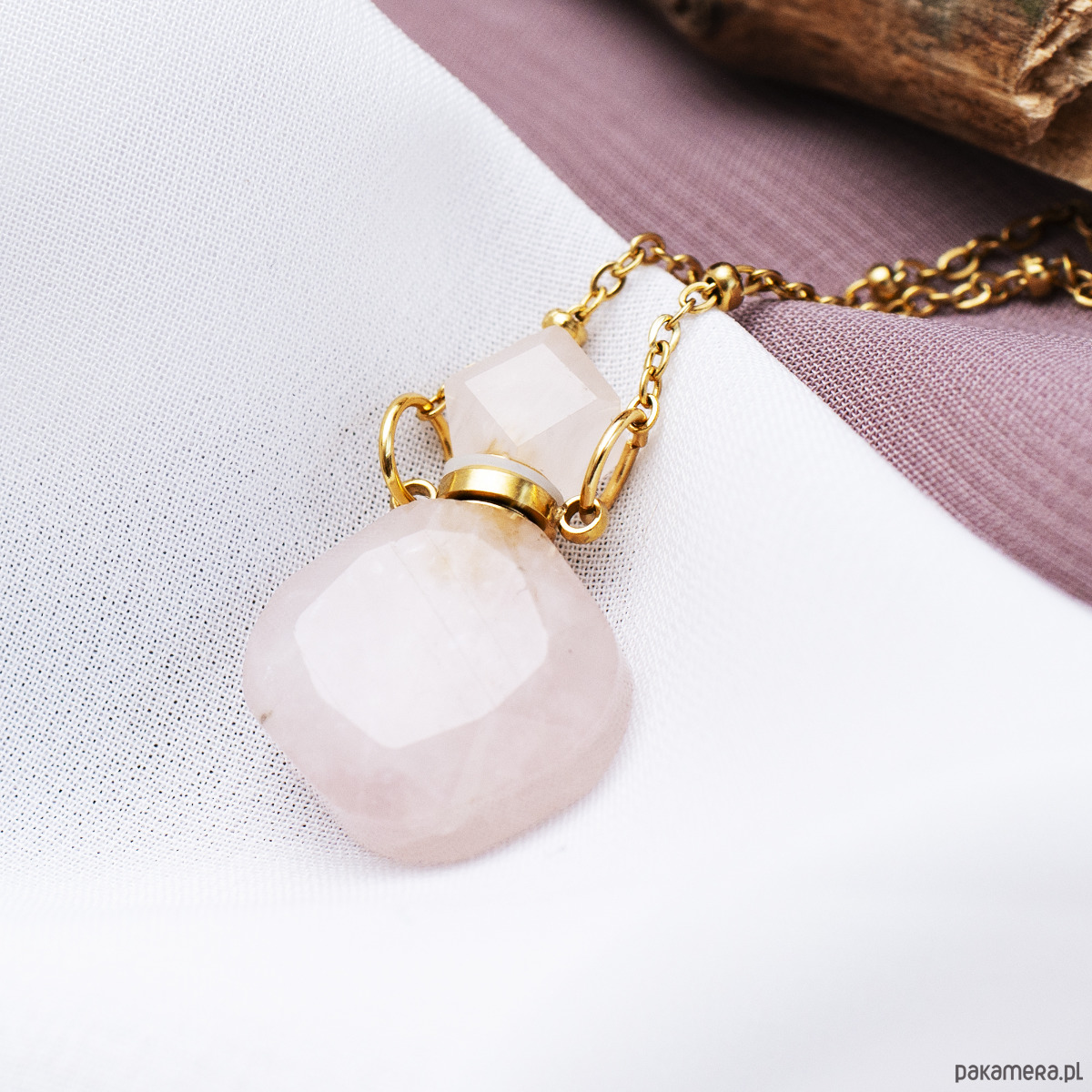 Kwarc Różowy nazywany jest kamieniem miłości, nie tylko tej do innych, ale przede wszystkim do samej siebie. Jego łagodna wibracja pomaga budować empatię, uciszać wewnętrznego krytyka i otwierać się na piękno otaczającego świata. Noszenie go blisko serca sprzyja budowaniu poczucia bycia godną wszystkiego, co najlepsze. Możliwość napełnienia flakonika ulubionym zapachem sprawia, że naszyjnik staje się narzędziem do pracy z Twoim samopoczuciem. Delikatny aromat uwalniany w ciągu dnia pomaga redukować napięcie i przywracać jasność umysłu w stresujących chwilach, pozwalając Ci zachować zmysłową równowagę. Możesz umieścić w nim zamiast perfum olejek eteryczny. Łańcuszek o dekoracyjnym splocie oraz elementy wykończenia wykonano ze stali chirurgicznej złoconej złotem, co gwarantuje długotrwały blask i odporność na ciemnienie. Materiał ten jest w pełni bezpieczny dla skóry, co pozwala cieszyć się tym unikalnym dodatkiem każdego dnia bez obaw o podrażnienia.