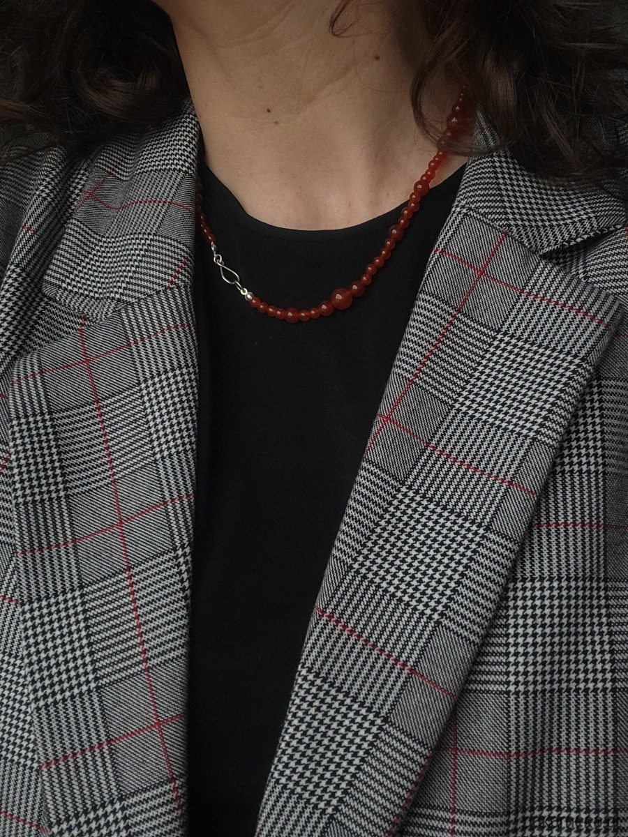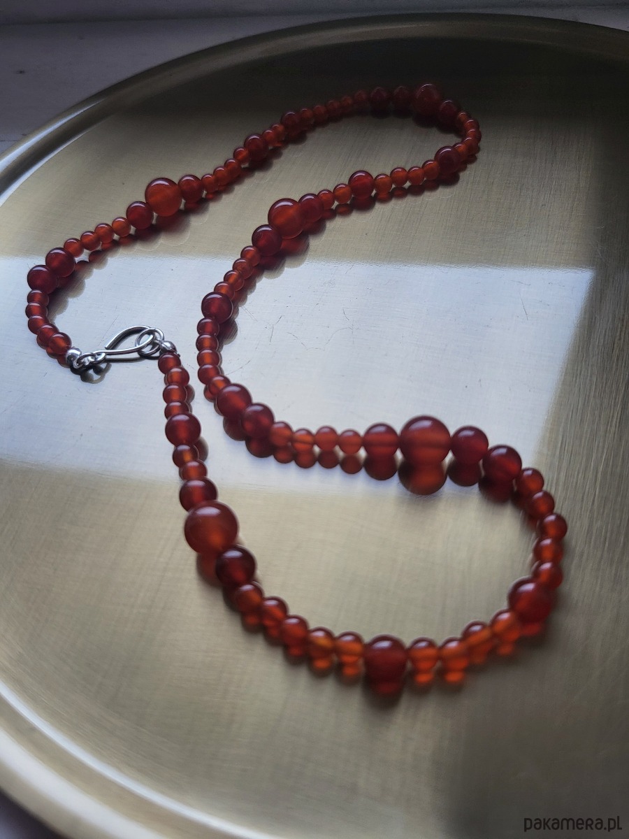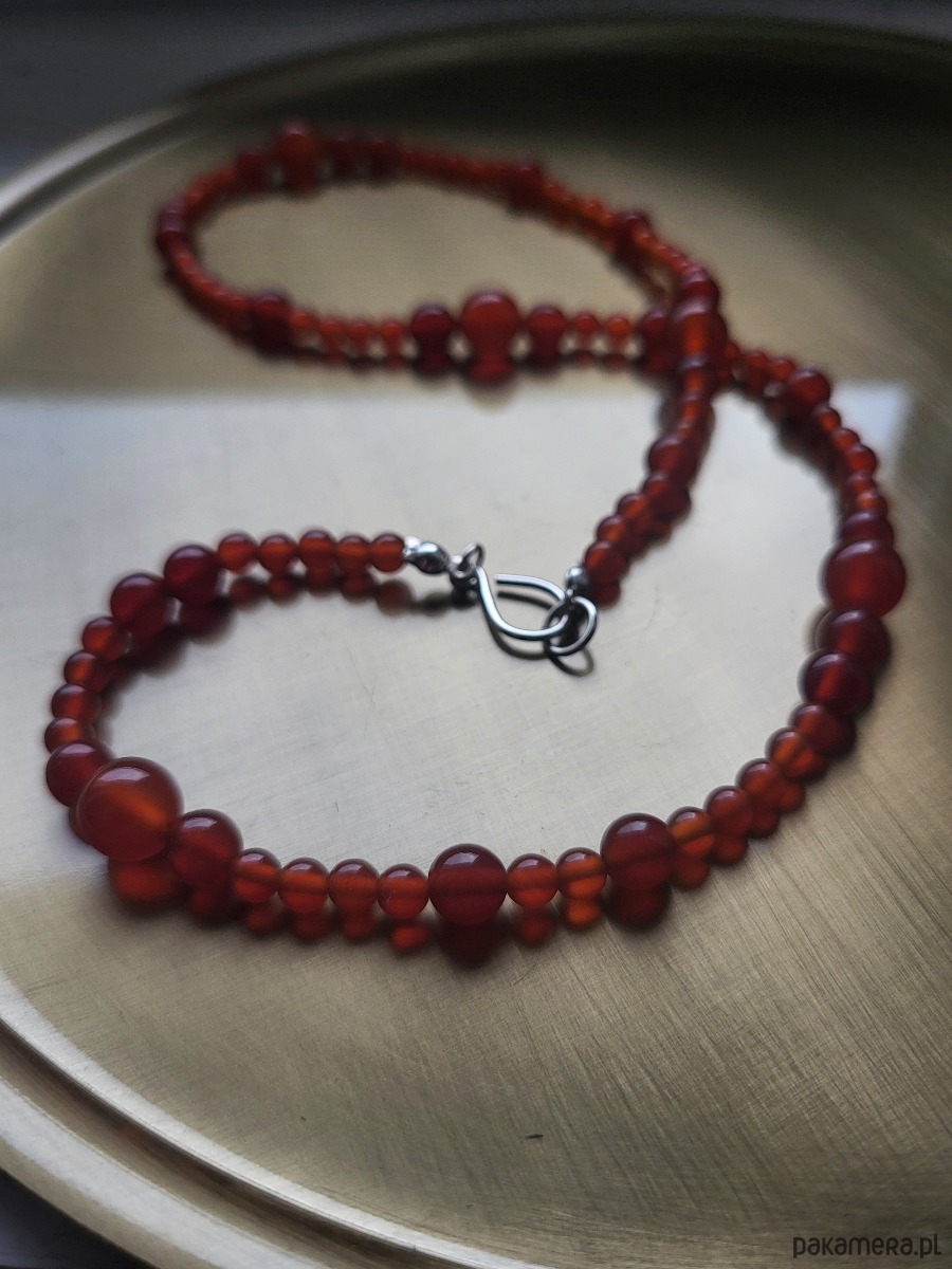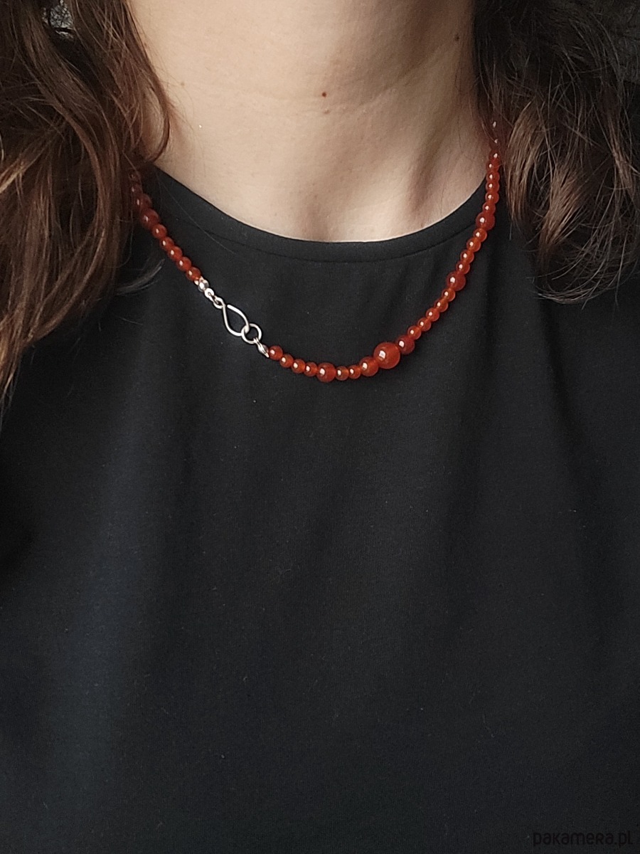 Naszyjnik FEMME to korale o różnej wielkości z agatu karneol z oryginalnym, ręcznie wykonanym zapieciem z wtórnie przetworzonego srebra.*