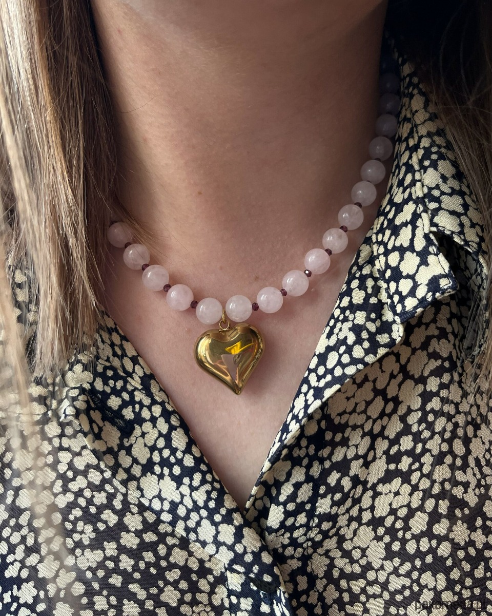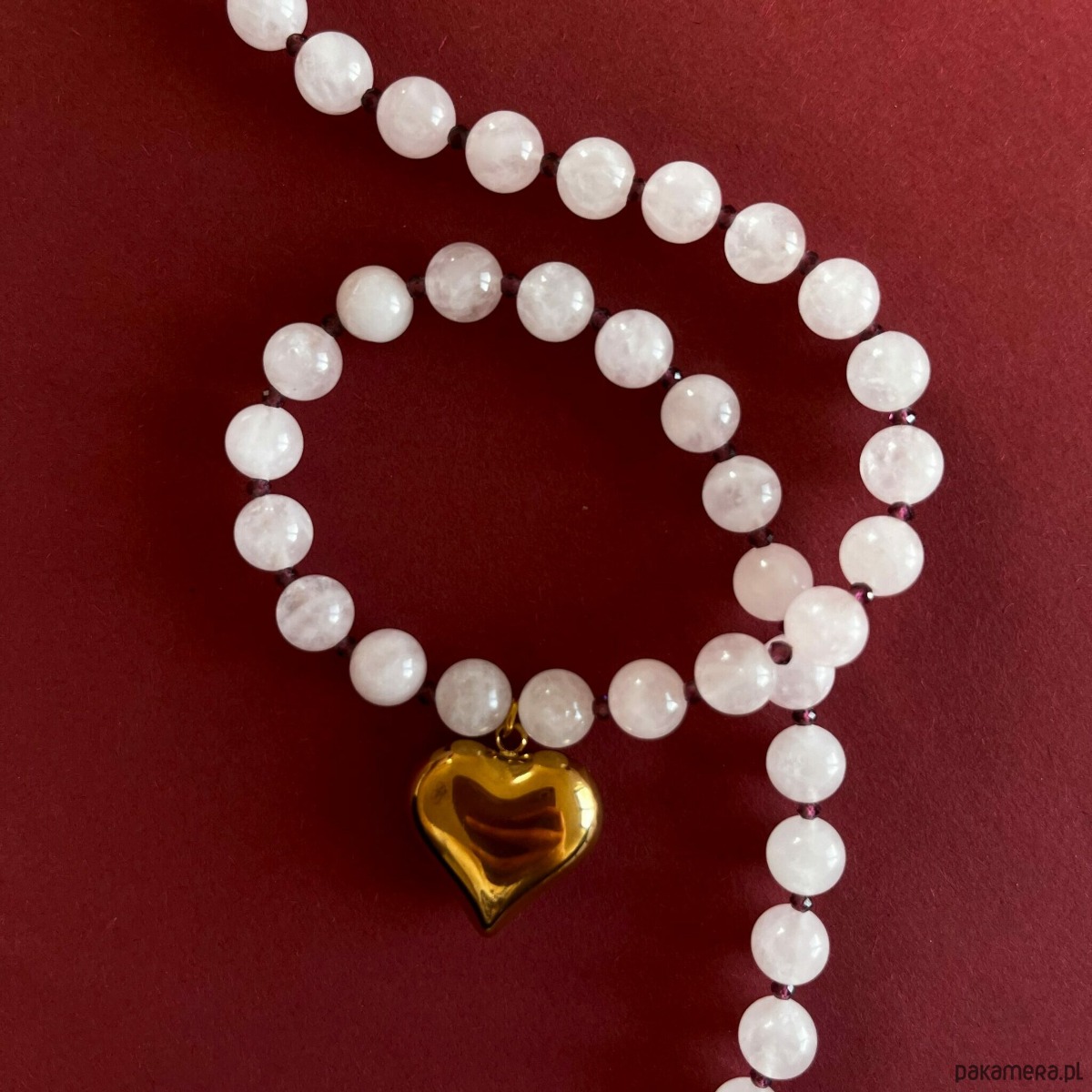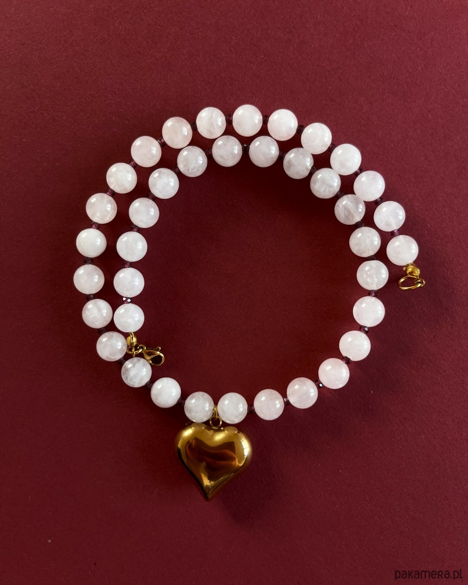 Skład: kwarc różowy, granat, serce ze stali pozłacanej