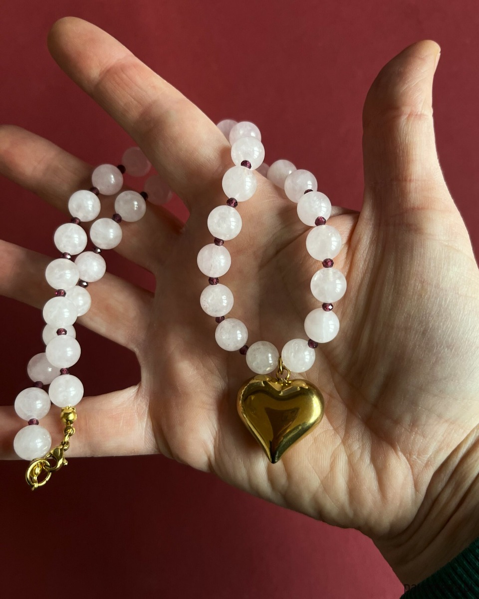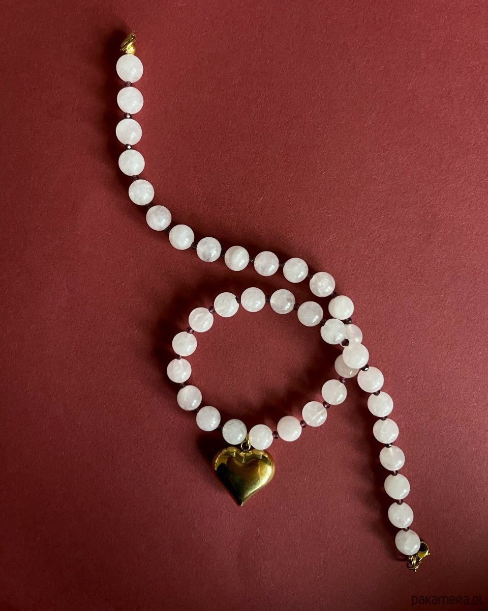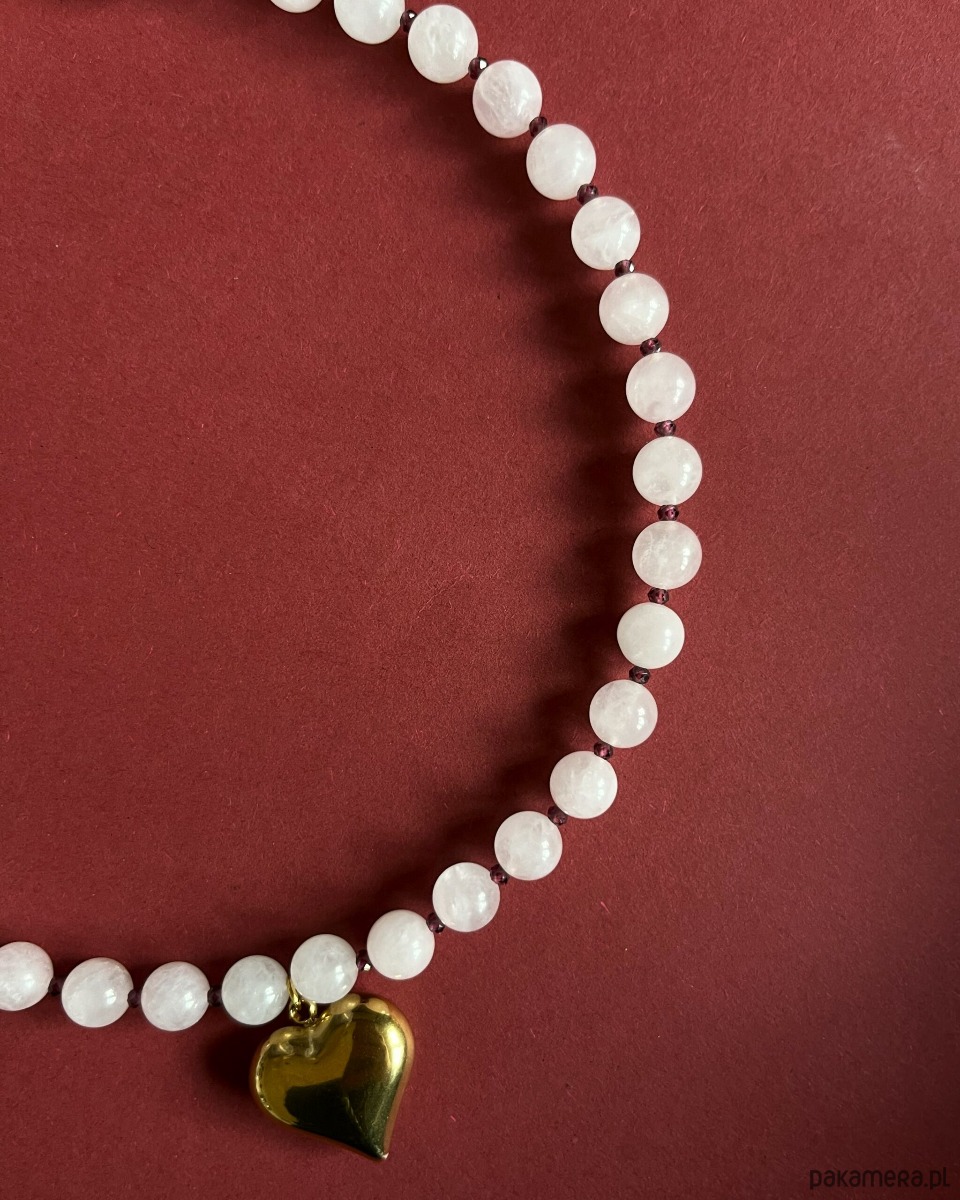 Skład: kwarc różowy, granat, serce ze stali pozłacanej