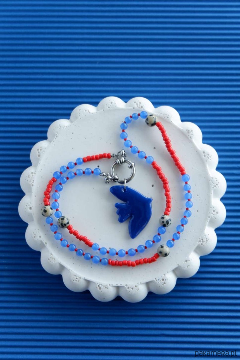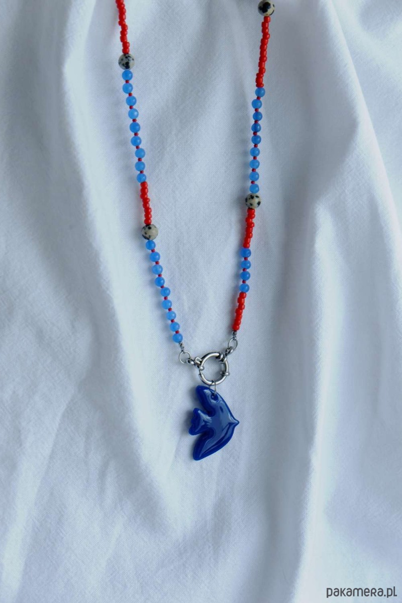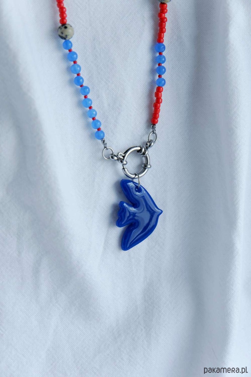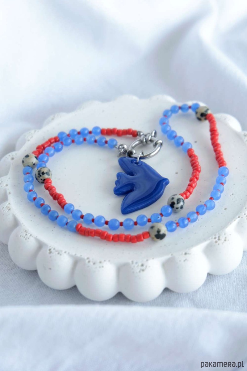 Skomponowany z koralików oraz kamieni szlachetnych, które idealnie dopełnia zawieszka BIRD w kobaltowym kolorze.