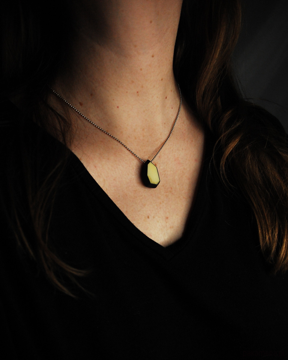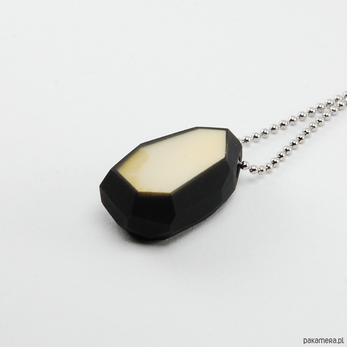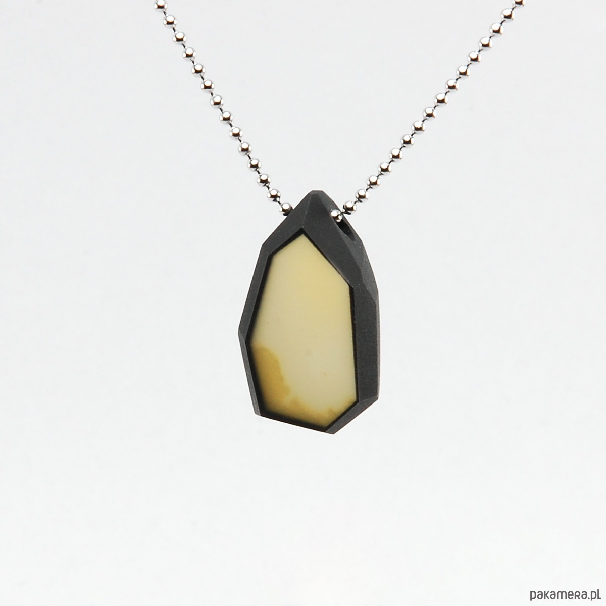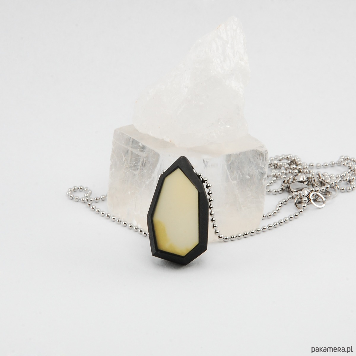 Unikatowy naszyjnik z bursztynem bałtyckim oprawionym w matowej czarnej żywicy. Bursztyn jest matowy. Wymiary bursztynu 12x22mm, długość łańcuszka 50cm + 5cm łańcuszka przedłużającego, łańcuszek i zapięcie są wykonane ze stali chirurgicznej. Istnieie możliwość wymiany na łańcuszek srebrny.