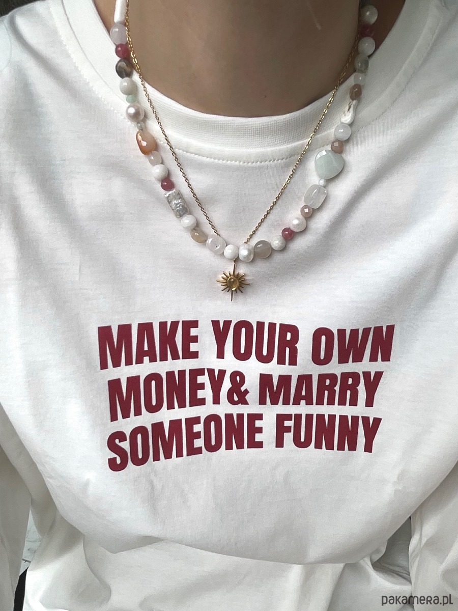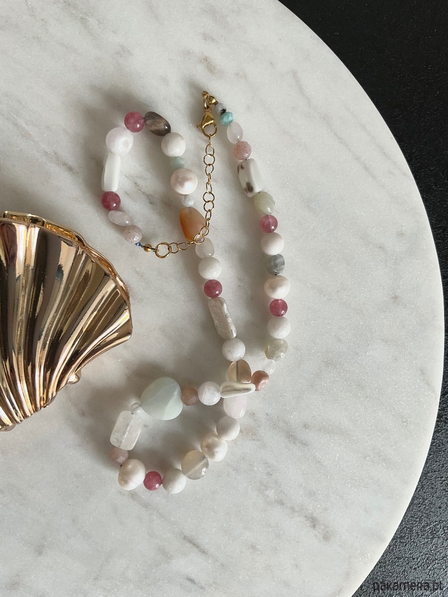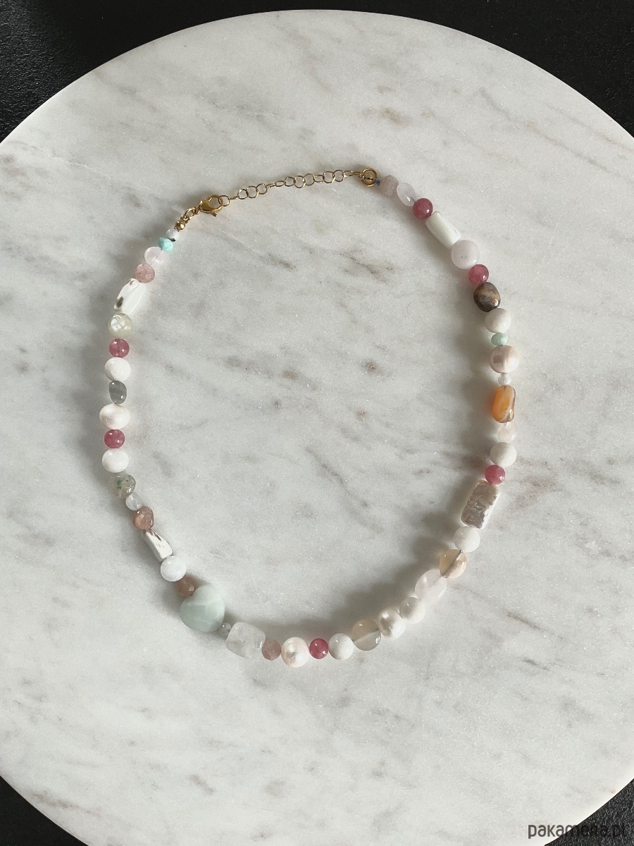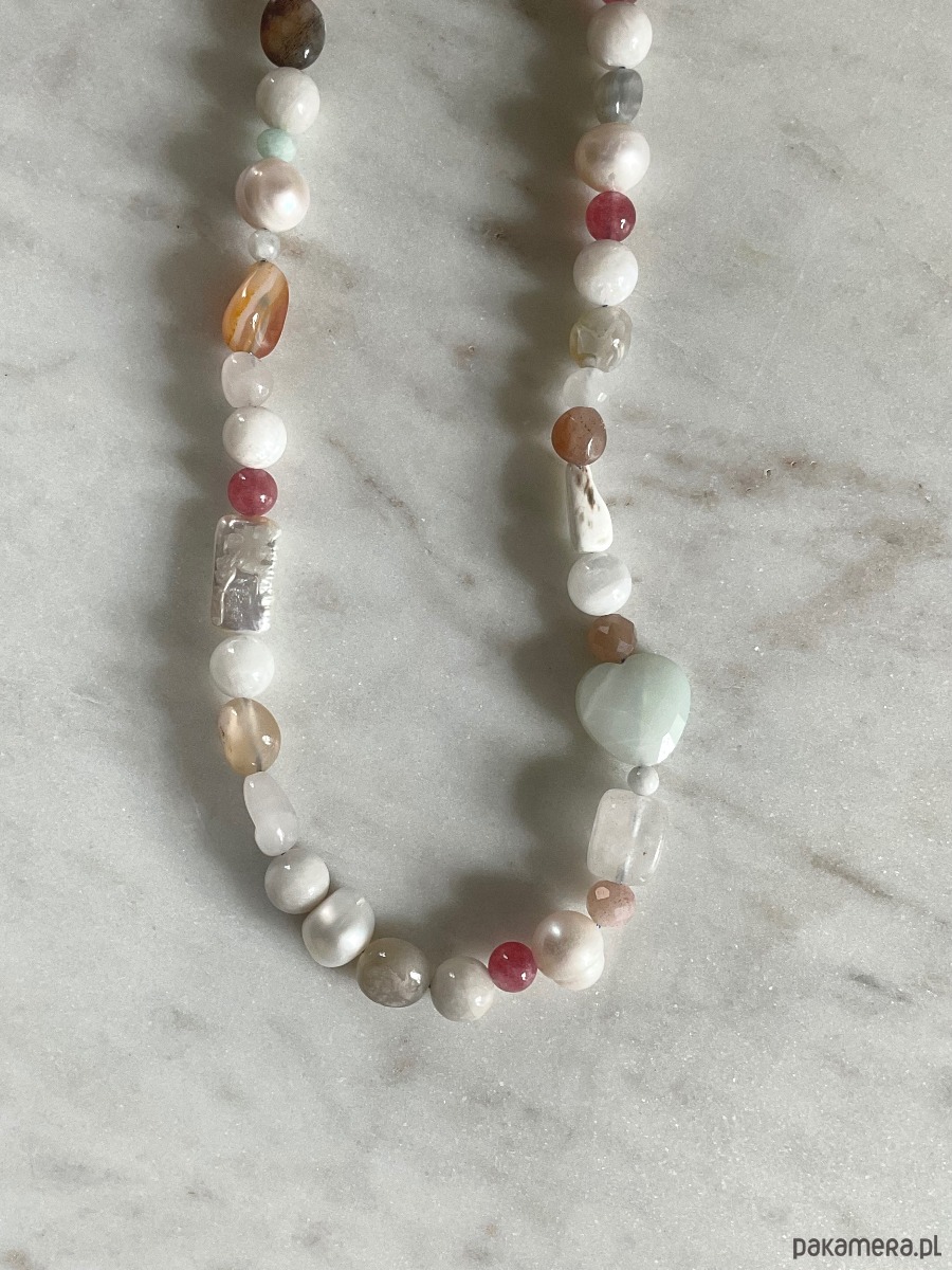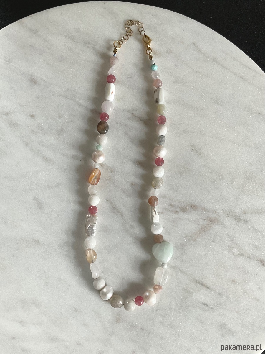 Naszyjnik kobiecy z mieszanki kamieni naturalnych takich jak jadeity, perły, kamienie księżycowe, muszle, kamienie słoneczne, kryształy górskie, amazonity, morganity,agaty.