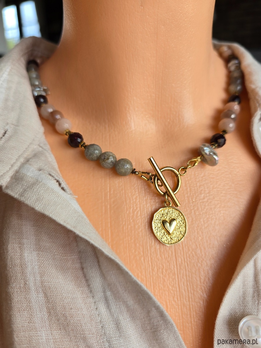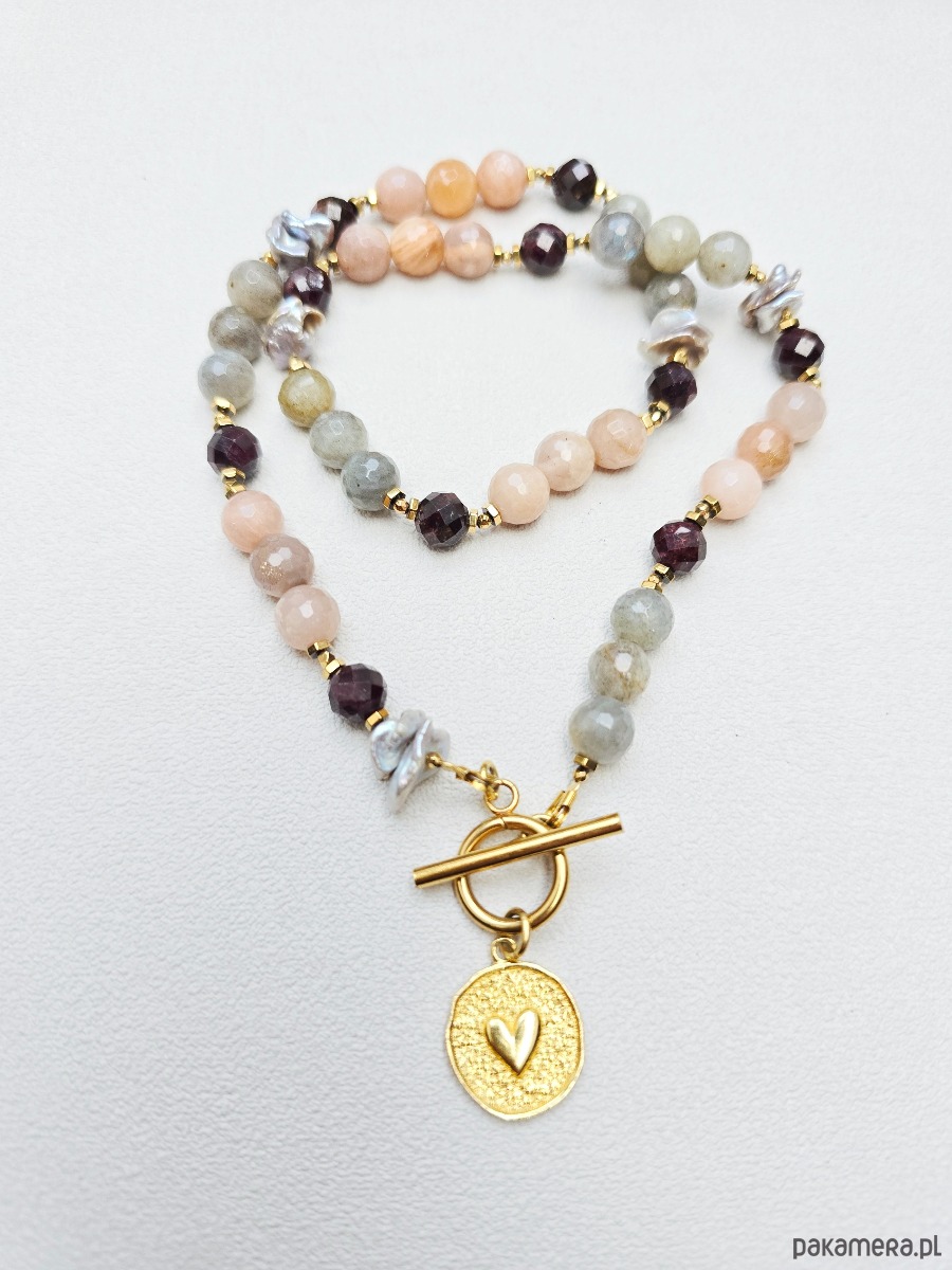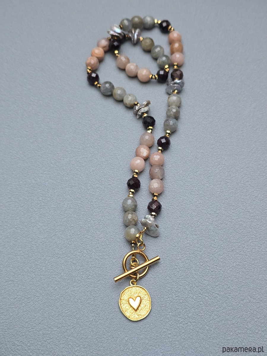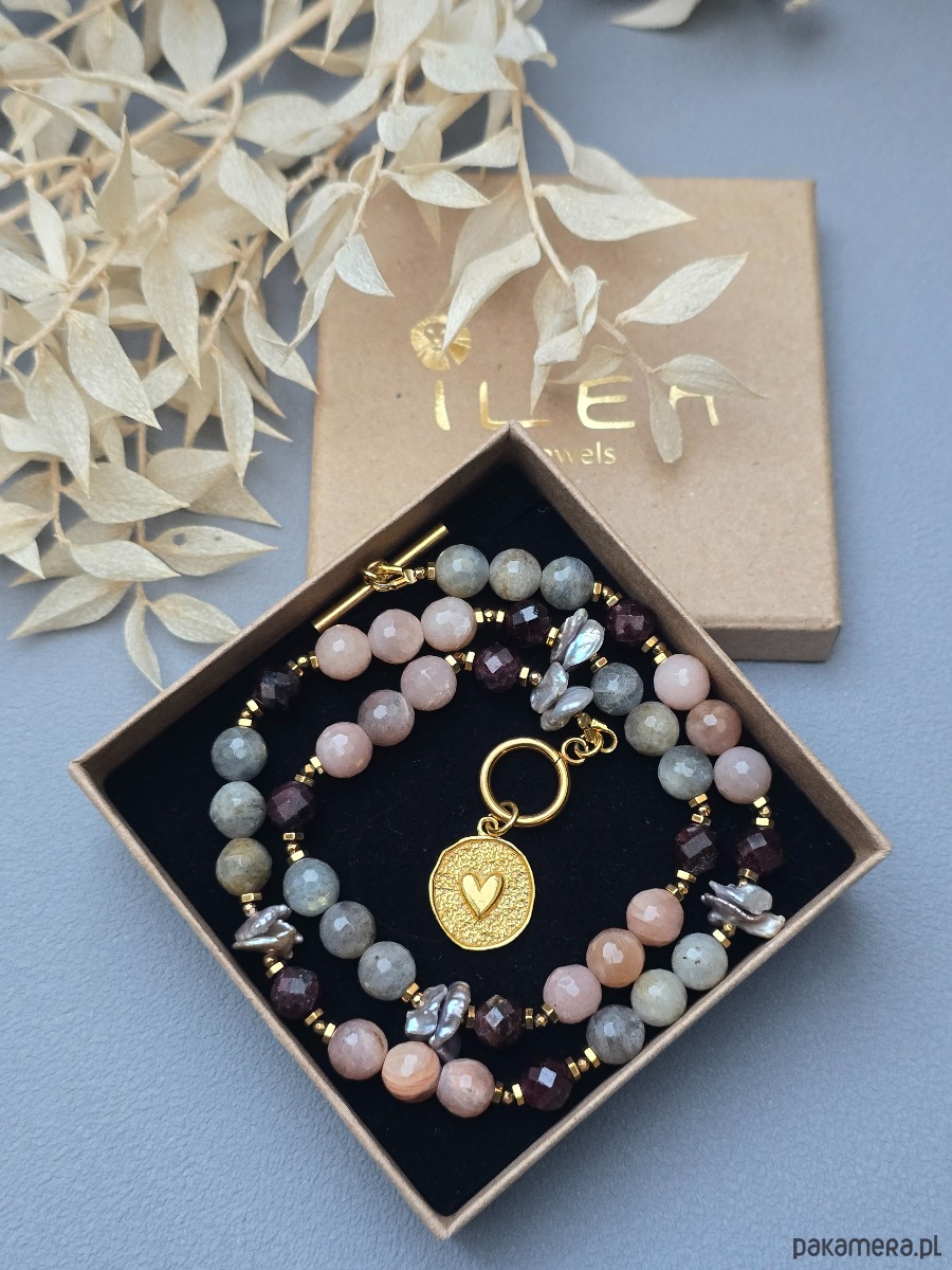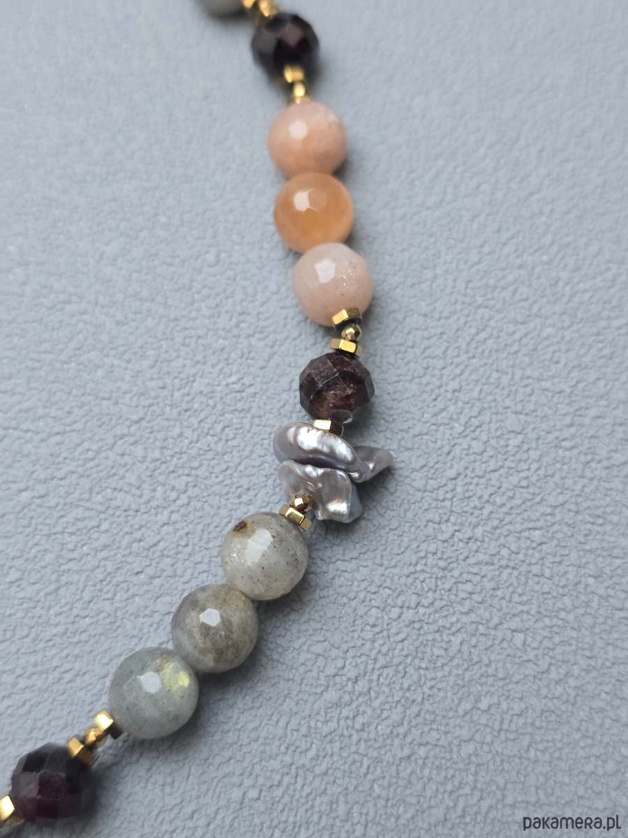 Wykorzystane kamienie: labradoryt, granat, złocony hematyt, kamień słoneczny i perły keishi