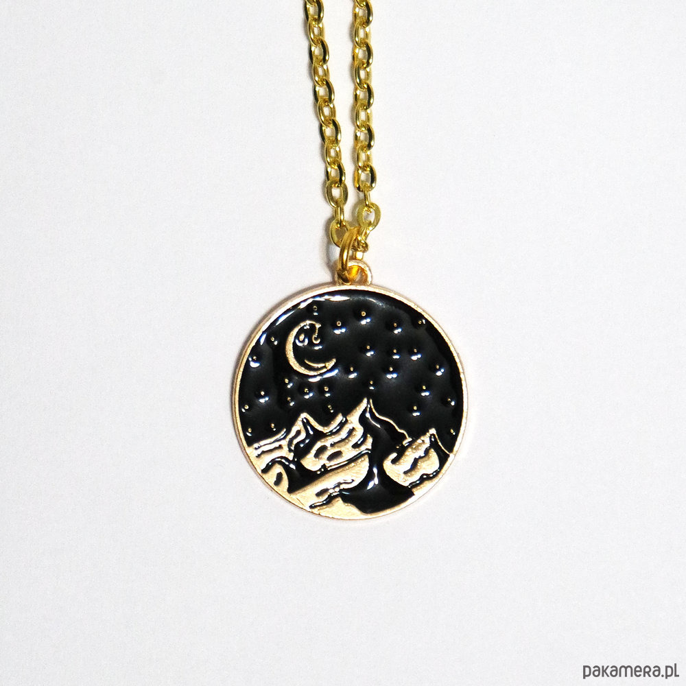 Naszyjnik z piękną zawieszką emaliowaną z motywem gór nocą.